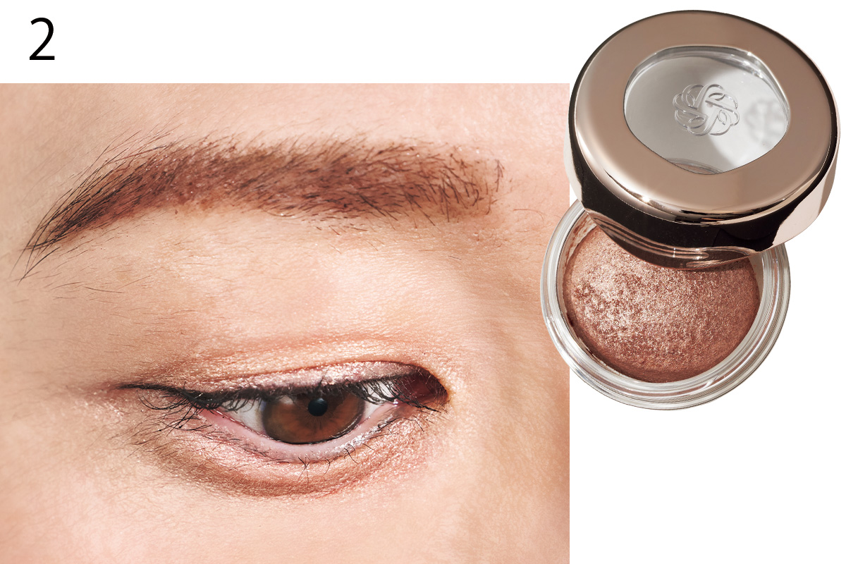 2.シャドウを指でアイホール全体にオン。ほのかな赤みを感じるパール入りブラウンで、生き生きとしたまぶたに。