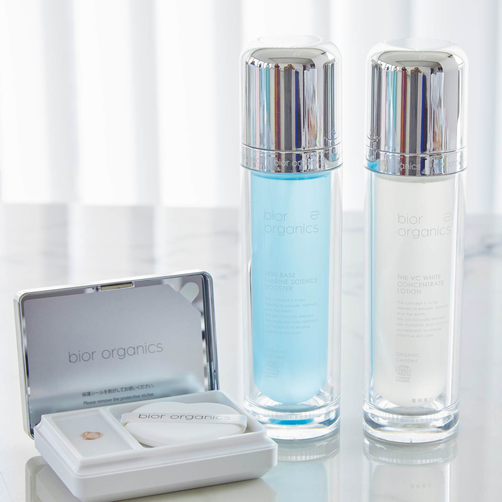 左から〈オーガニックアクアクッション〉最初のヒット商品。〈スキンベース マリンサイエンス ブースター〉〈オーガニック認証 薬用美白ローション〉オーガニックと美白を両立した新商品。容器はリサイクル可能。