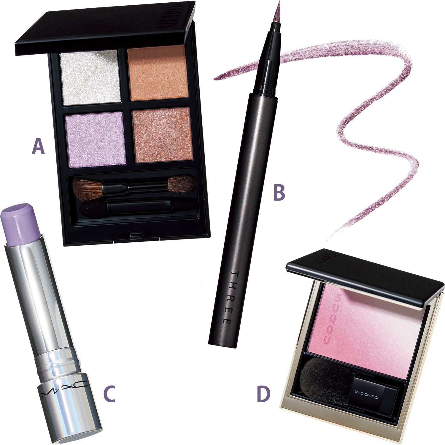 A:ブルーパールが煌めくパープルと相性抜群のベージュ&ブラウン配色。アディクション ザ アイシャドウ パレット +006 Hidden Orchid ¥6,820(ADDICTION BEAUTY)B:目の透明感を引き出しつつ、フレームを強調するシルバーたっぷりのメタリックパープル。THREE ファントゥファンキーリキッドアイライナー 02 ¥3,300(THREE)C:1色でも、手持ちのリップと重ねても透明感を引き出せる透け感ラベンダー。M・A・C グロー プレイ テンダートーク リップ バーム バイブ ¥3,960(M・A・C)D:透明感と淡い血色感が生まれる、ライラックとアイシーバイオレットのグラデーション。サラリと仕上がる。SUQQU ブラーリング カラー ブラッシュ 06 ¥6,600(SUQQU)