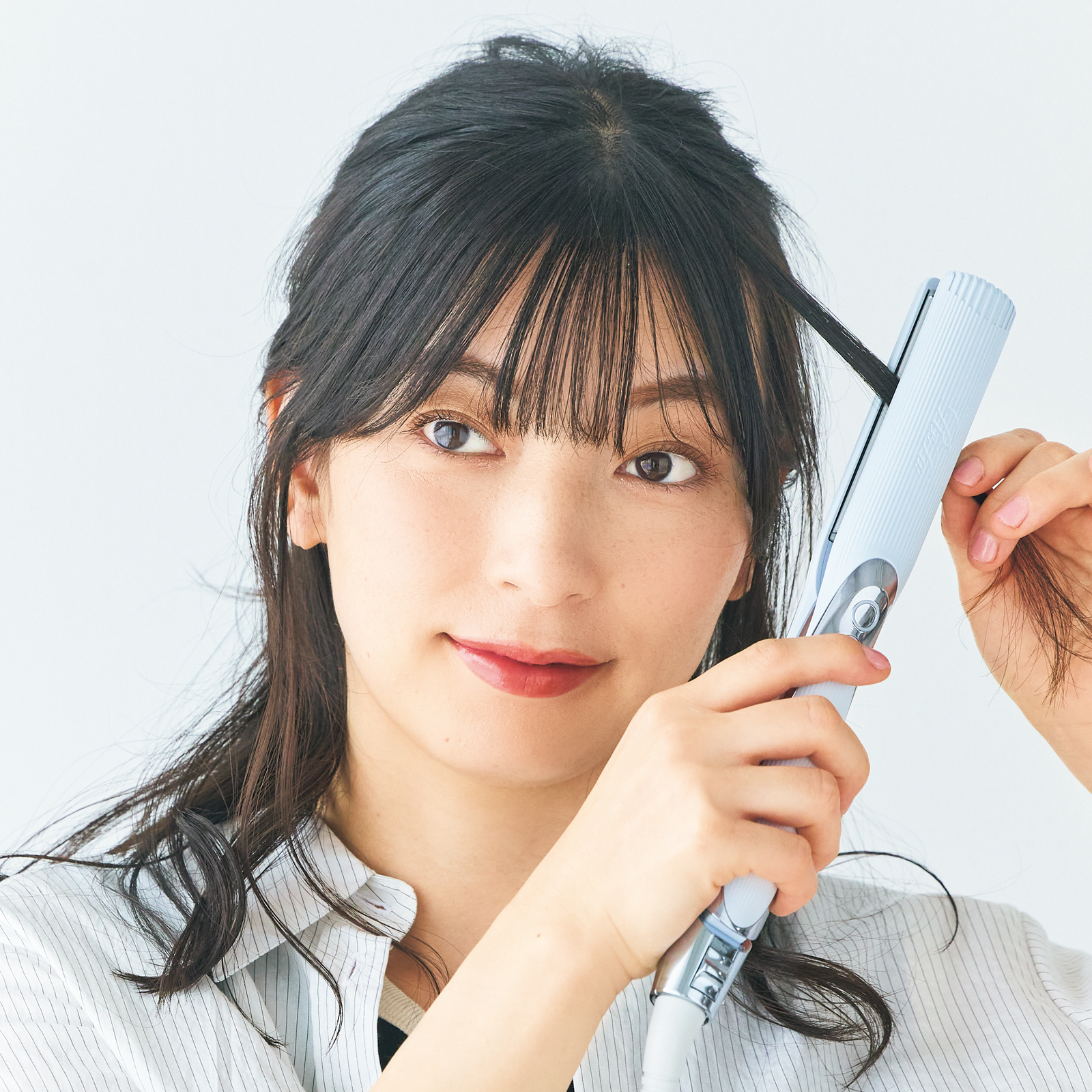 2.前髪と顔周りに下ろした髪の根元が潰れるようにストレートアイロンを通します。