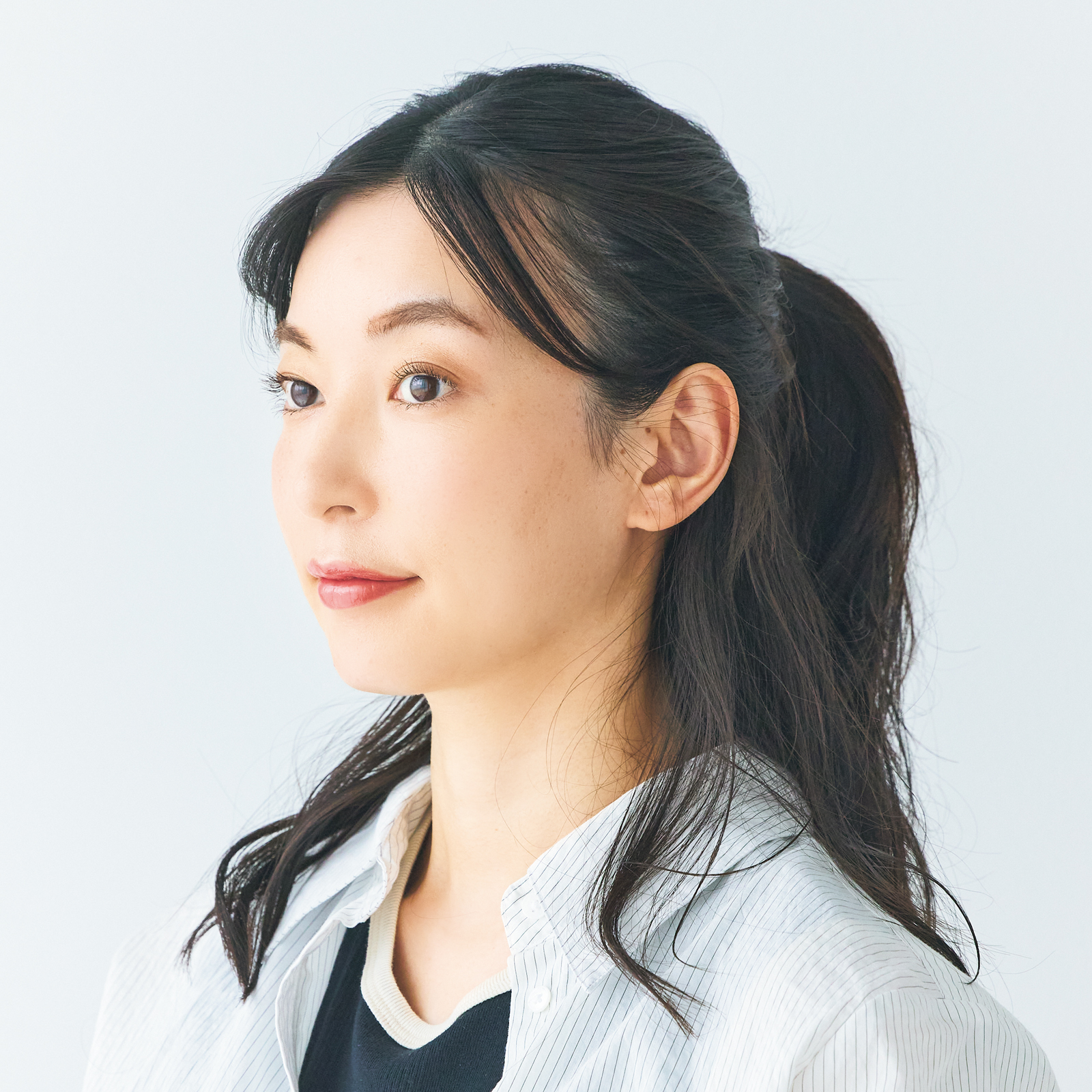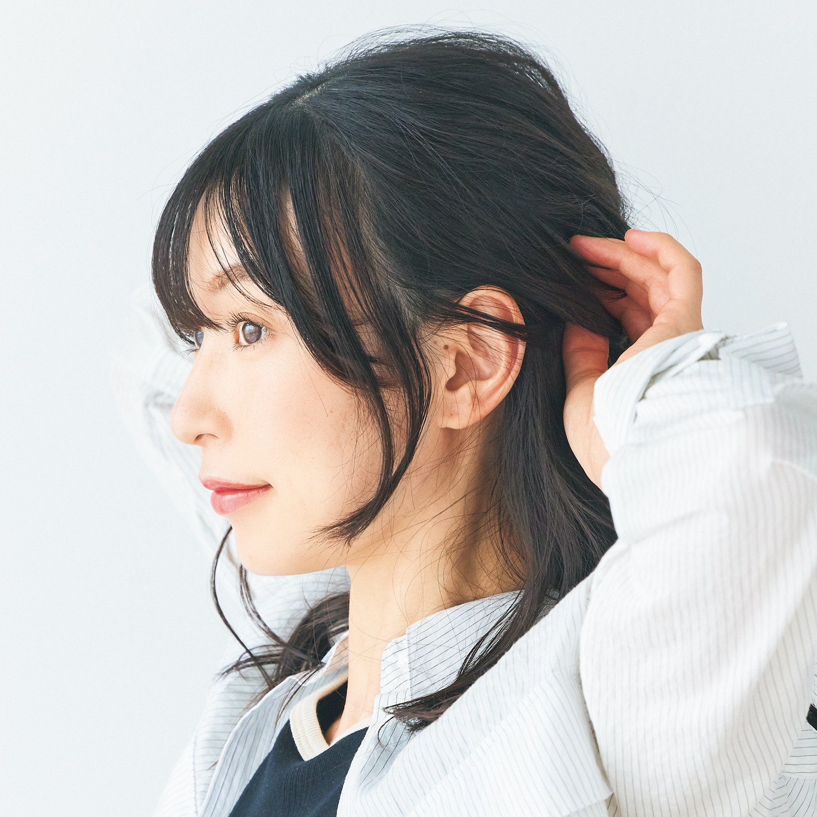 フェイスラインを丸出しにすると、顔周りの細い白髪が目立ちます。ハーフアップだけでなく、後ろでひとつ結びにするのも避けて。