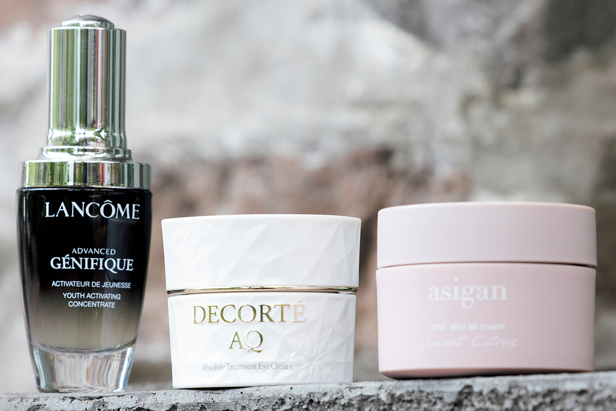 ランコムのジェニフィック、コスデコのアイクリーム、asiganのCBDクリームをシェア。コスメで肌は変わるので、自分に合うものを厳選して愛用中。