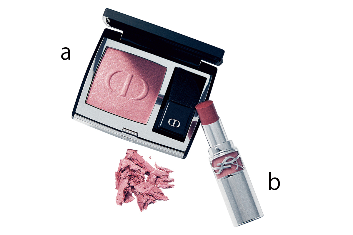 a「チークの青みピンクは血色感と冴え感UP」ディオールスキン ルージュ ブラッシュ 212 ¥7,700(パルファン・クリスチャン・ディオール)b「真っ赤よりも肌に馴染む私の定番カラー」YSL ラブシャイン リップスティック 44 ¥5,940(イヴ・サンローラン・ボーテ)