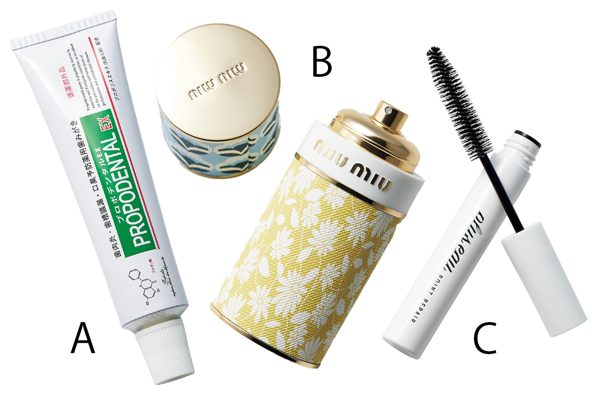 A「プロポリス入りでお気に入り」プロポデンタルEX ¥1,650[医薬部外品](日本自然療法)B「香水は甘さよりも爽やかさ重視」ミュウミュウ レゾーアラモード ヘッドインザクラウズ オードトワレ 50ml ¥14,960(ブルーベル・ジャパン)C「娘から教えてもらった飛び出た毛の直し」プリュスオー ポイントリペア¥1,210(多田)