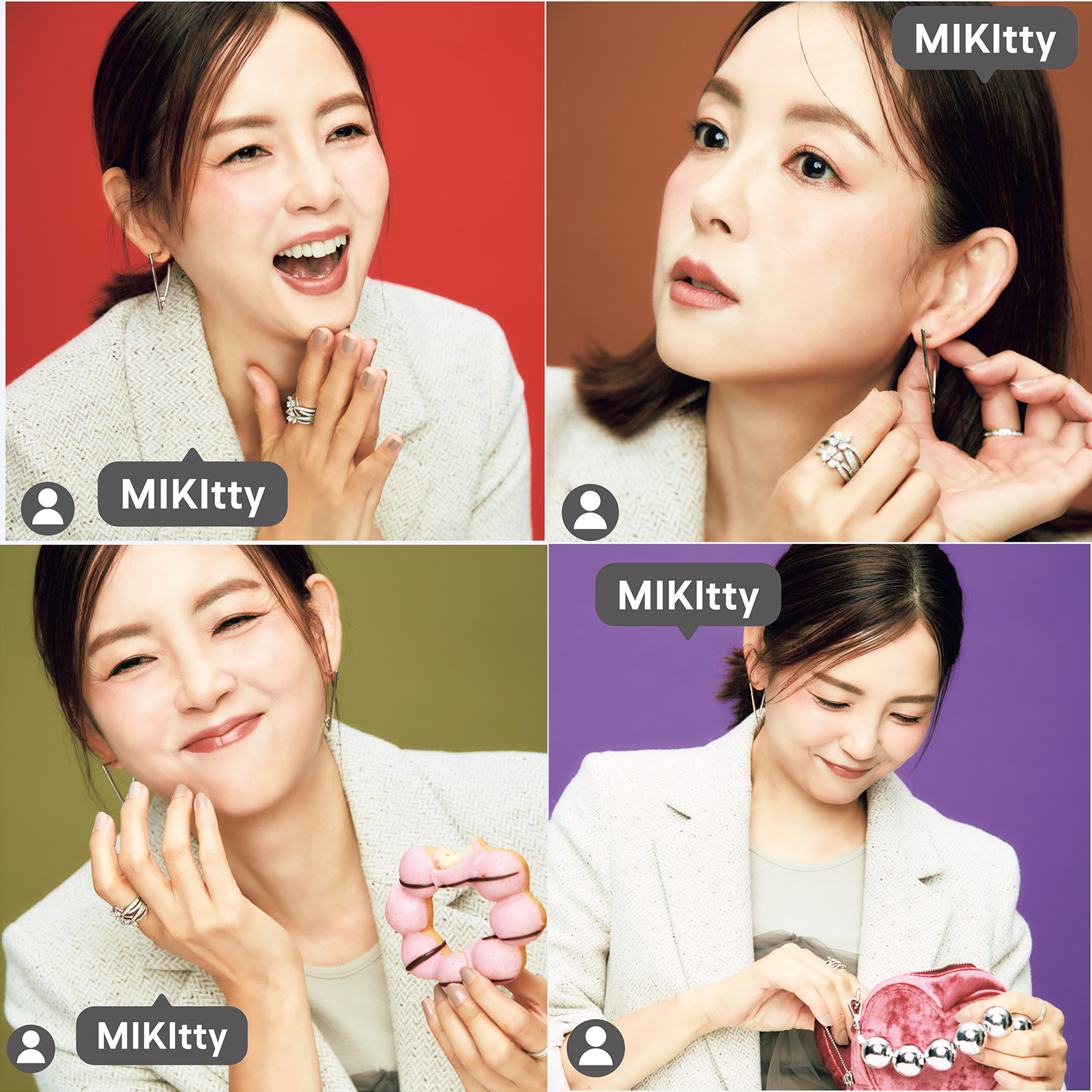黒のトップス¥16,500(カデュネ)ピアス¥10,800、太リング¥9,450、フォークリング¥4,950(すべてアビステ)薄グレーのブレザー¥40,000(バナナ・リパブリック)カットソー¥19,800、バッグ¥16,500(ともにCOEL)ピアス¥3,780、フラワーリング¥35,700、ホールストーンリング¥7,700、(すべてアビステ)