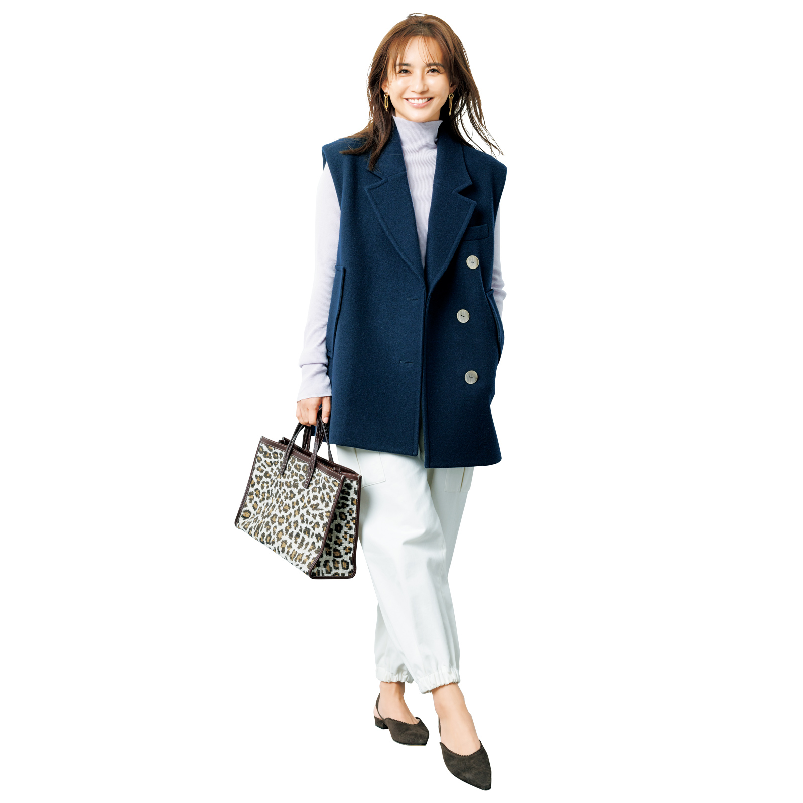 【No-sleeve type!】Vあきが深いほど小顔効果を後押しします。膨張しがちな色の上にさっと羽織って着たい色も着痩せも両立させて。ジレ¥52,800(ランバン オン ブルー/レリアン)ニット¥8,470(Mila Owen/Mila Owen ルミネ新宿2店)パンツ¥39,600(アンタイトル)バッグ¥58,300(ア ヴァケーション/ノーベルバ)パンプス¥59,400(ネブローニ)ピアス¥3,960(ヘンカ/ロードス)
