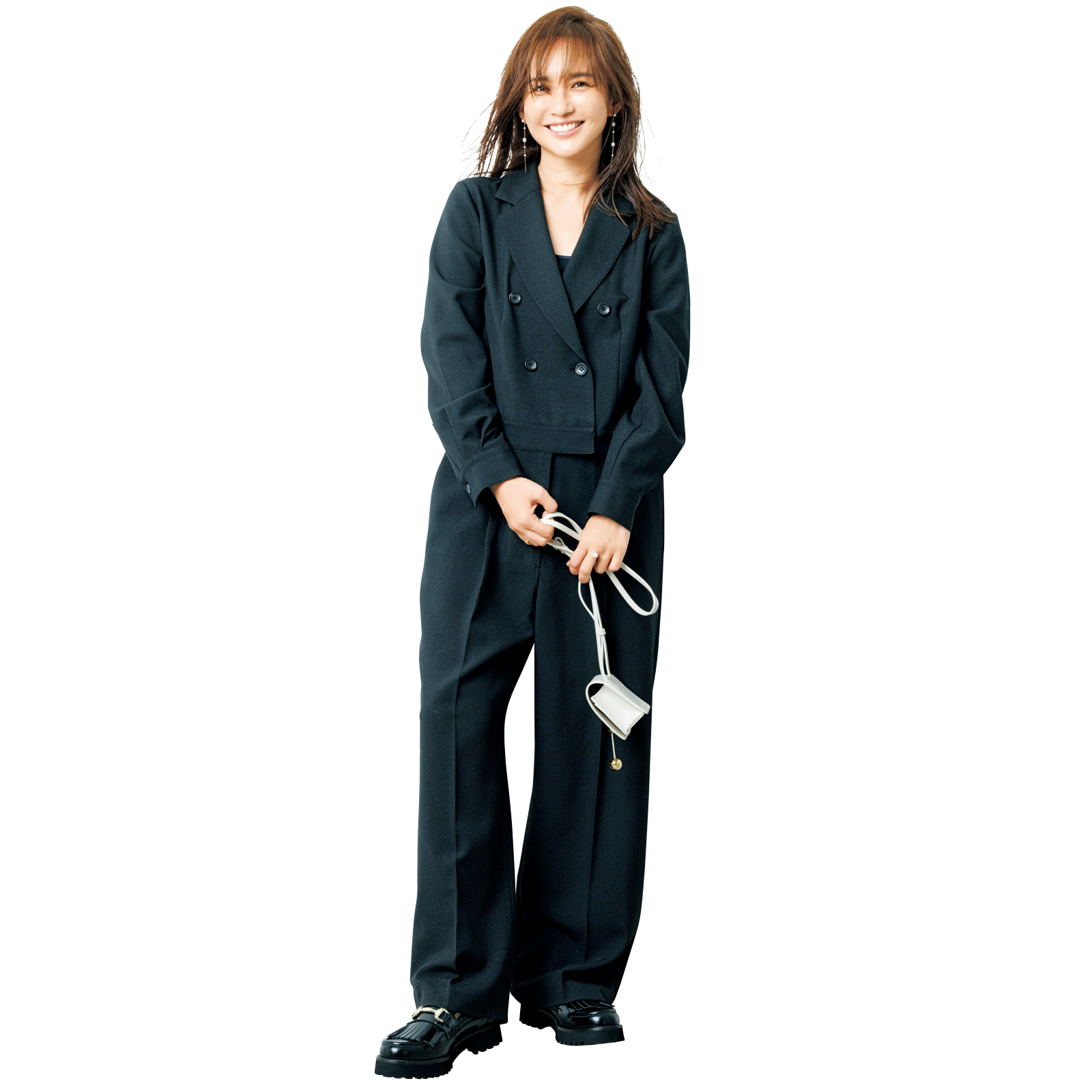 すっきりとしたシルエットで縦に長い印象も。オールインワン¥29,700(ザ ポーズ/ウィム ガゼット 青山店)バッグ¥38,500(メアリ オル ターナ/AL Design Inc.)ローファー¥51,700(プリティ・バレリーナ/F.E.N.)ピアス¥9,900(ripsalis/ロードス)ダブルフィンガーリング[左手]¥37,400〈モニス〉リング[右手]¥59,400〈アナプノエ〉(ともにフォーティーン ショールーム)