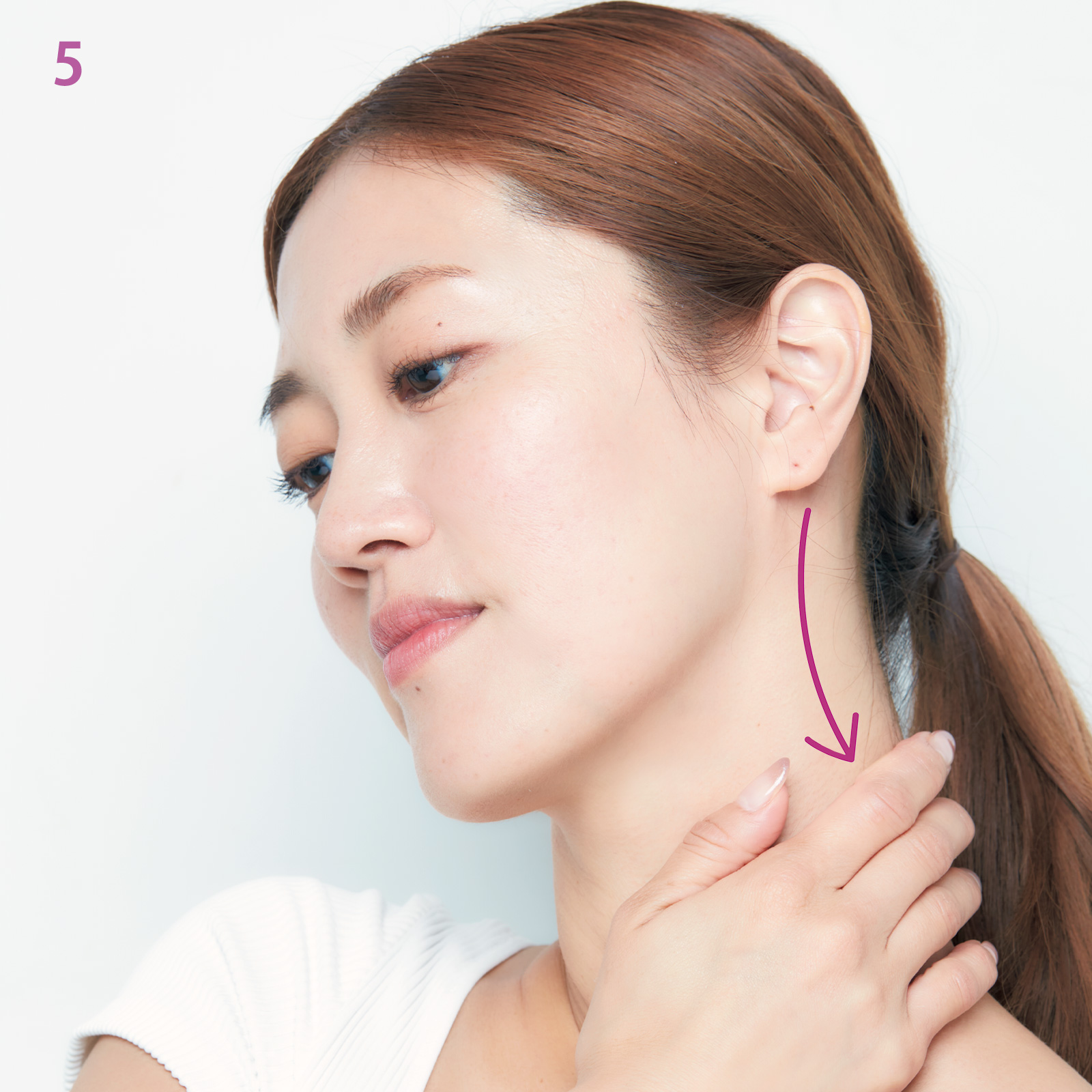 5.仕上げに手のひら全体で首筋を流します。上から下に撫でるように。首筋を柔らかくすることで二重顎防止に繋がります。