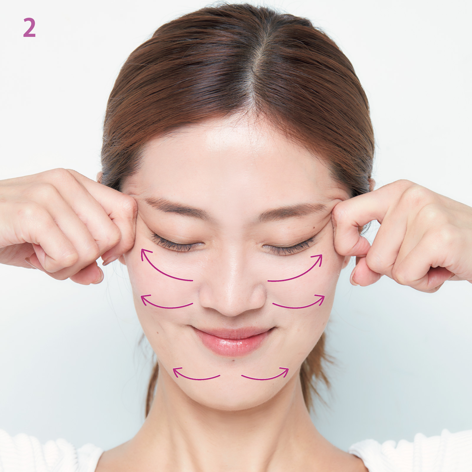 2.次は人差し指をカギ指にし、第一関節と第二関節の間を使います。1と同様に顔を3分割して内から外に流します。2往復行って。