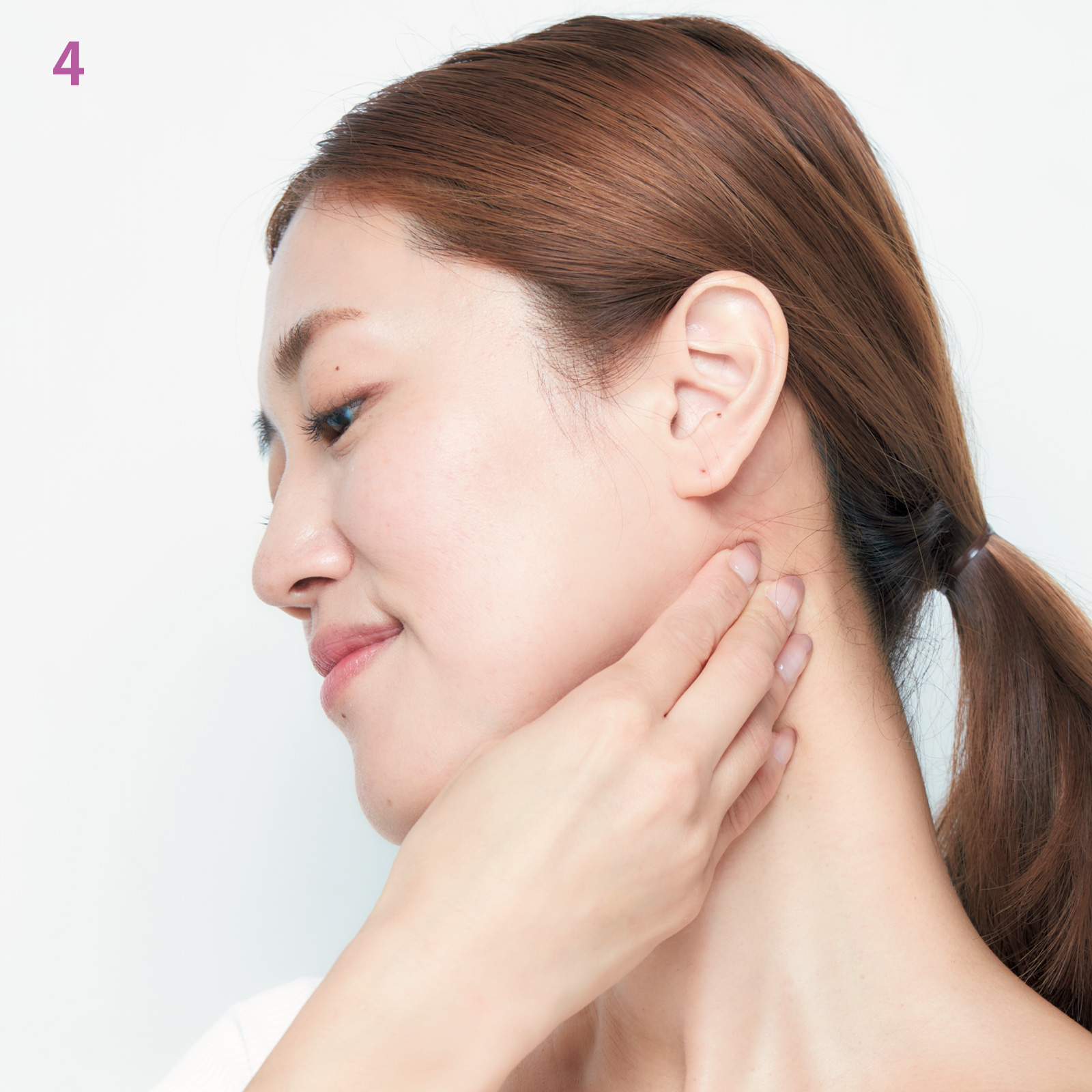 4.しっかりとした首筋をほぐします。親指以外の4本の指で首のサイドの太い筋を押し揺らします。ほぐす側と反対側の指で行います。