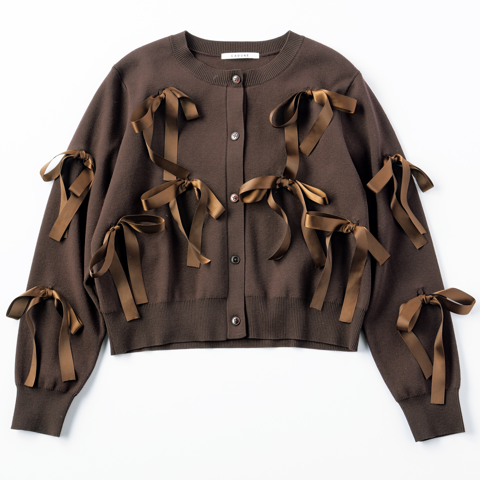 品のいい光沢を放つサテンリボンをあしらったカーデは、パンツと合わせて辛口に。リボン付きニットカーディガン¥20,900(カデュネ)