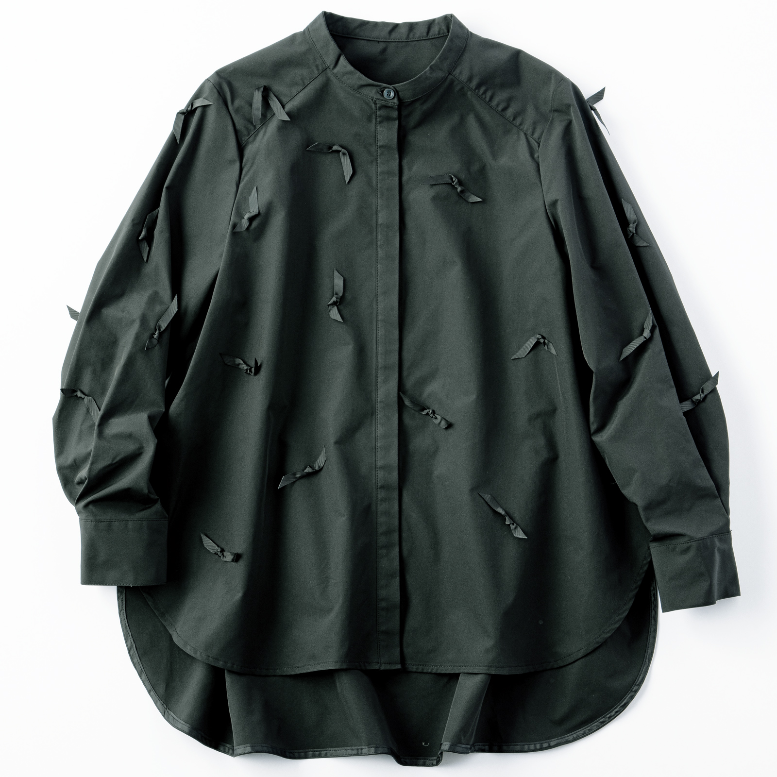 ブラックのシャツに同色の小さなリボンが。大人らしい甘さを楽しめます。リボン付きブラウス¥18,700(シークレット・トロフィー)