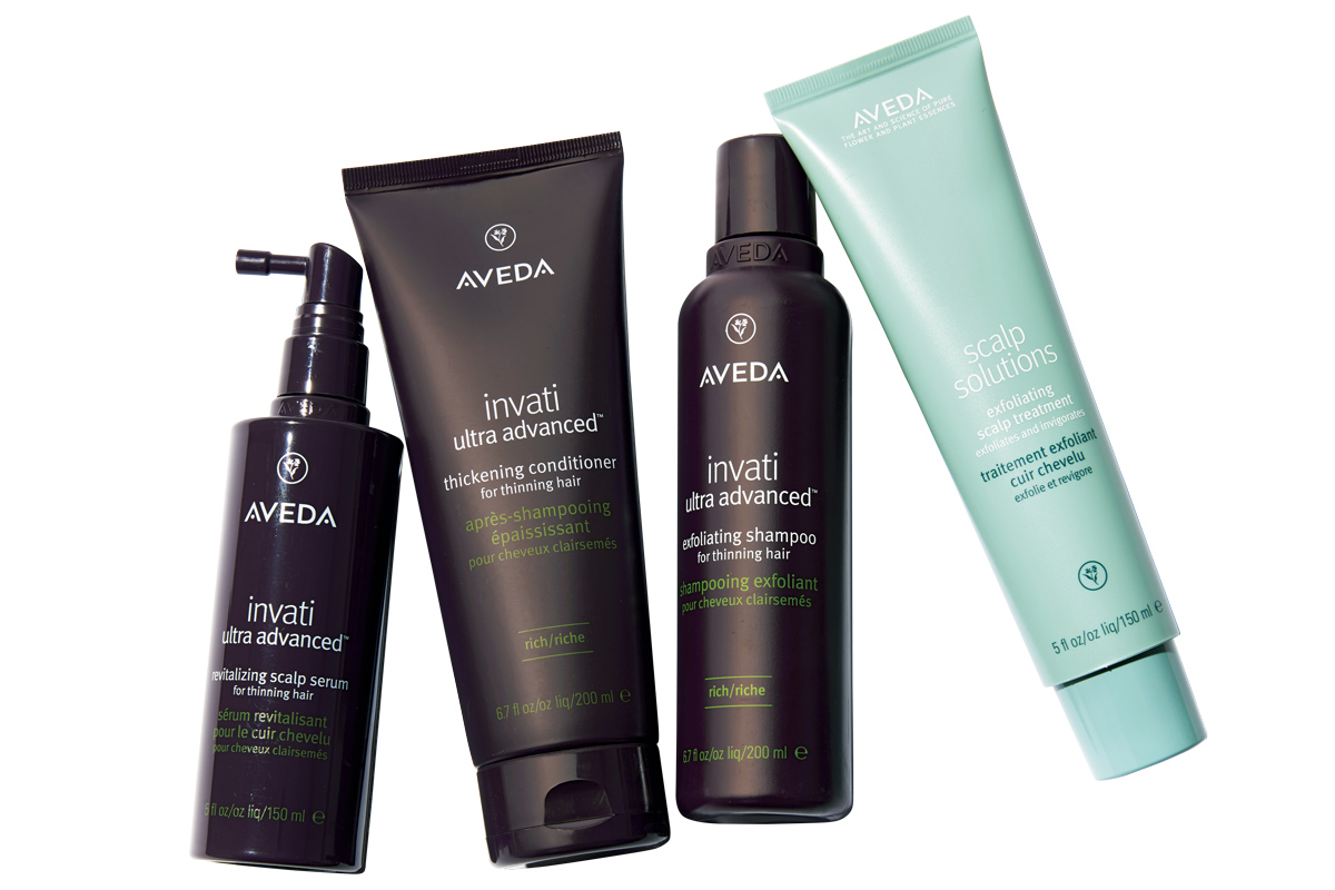 薄毛に最大の相乗効果を生み出す4STEPケア。左から/インヴァティ ウルトラ アドバンス エクスフォリエイティング スカルプ セラム 150ml ¥9,680、同 ヘアデンス コンディショナー〈リッチ〉 200ml ¥5,720、同 シャンプー〈リッチ〉200ml ¥5,060、スカルプ ソリューション エクスフォリエイティング スカルプ トリートメント 150ml ¥6,380(すべてアヴェダ)