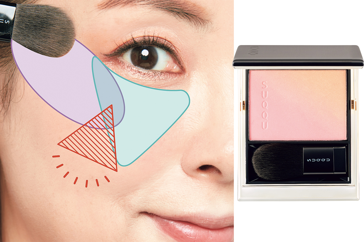 今すぐできるリフトアップのやり方はこちら!チークを頰に逆三角に入れ(ブルー)、少し重なるようこめかみへオン(紫)。重ねた部分の下に色をのせなかった三角ゾーン(赤)ができ、そこにツヤが残ることで引き上がって見える効果が!