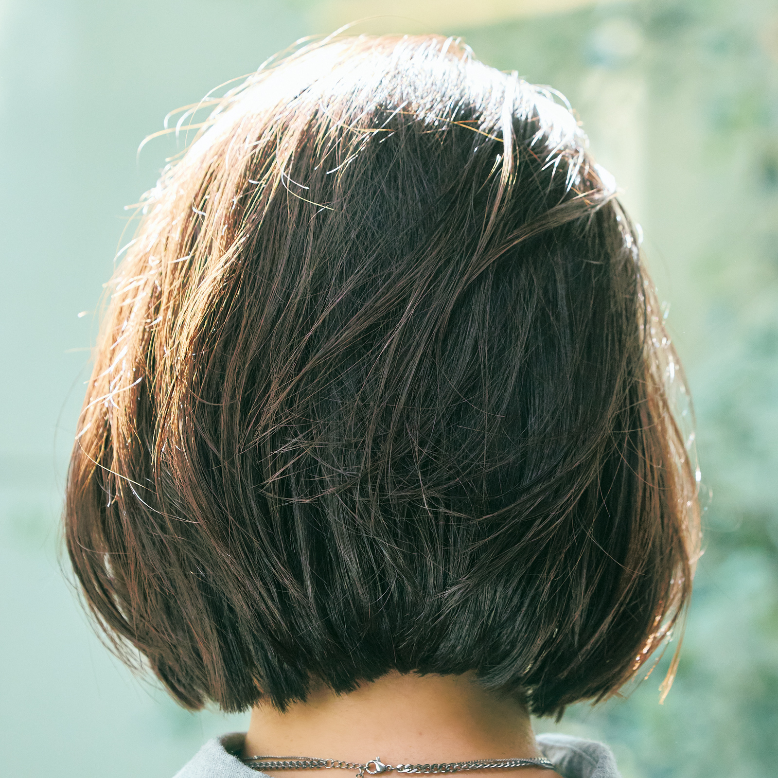 衿足下2~3cmの前下がりのボブに、顔周りは鼻下くらいからレイヤーを。内巻きにブローしたらバームを軽くもみ込んで今時なパサッとした質感に。前髪は8:2くらいの深めから分けてトップに高さを出して若々しく見せるのがコツ。
