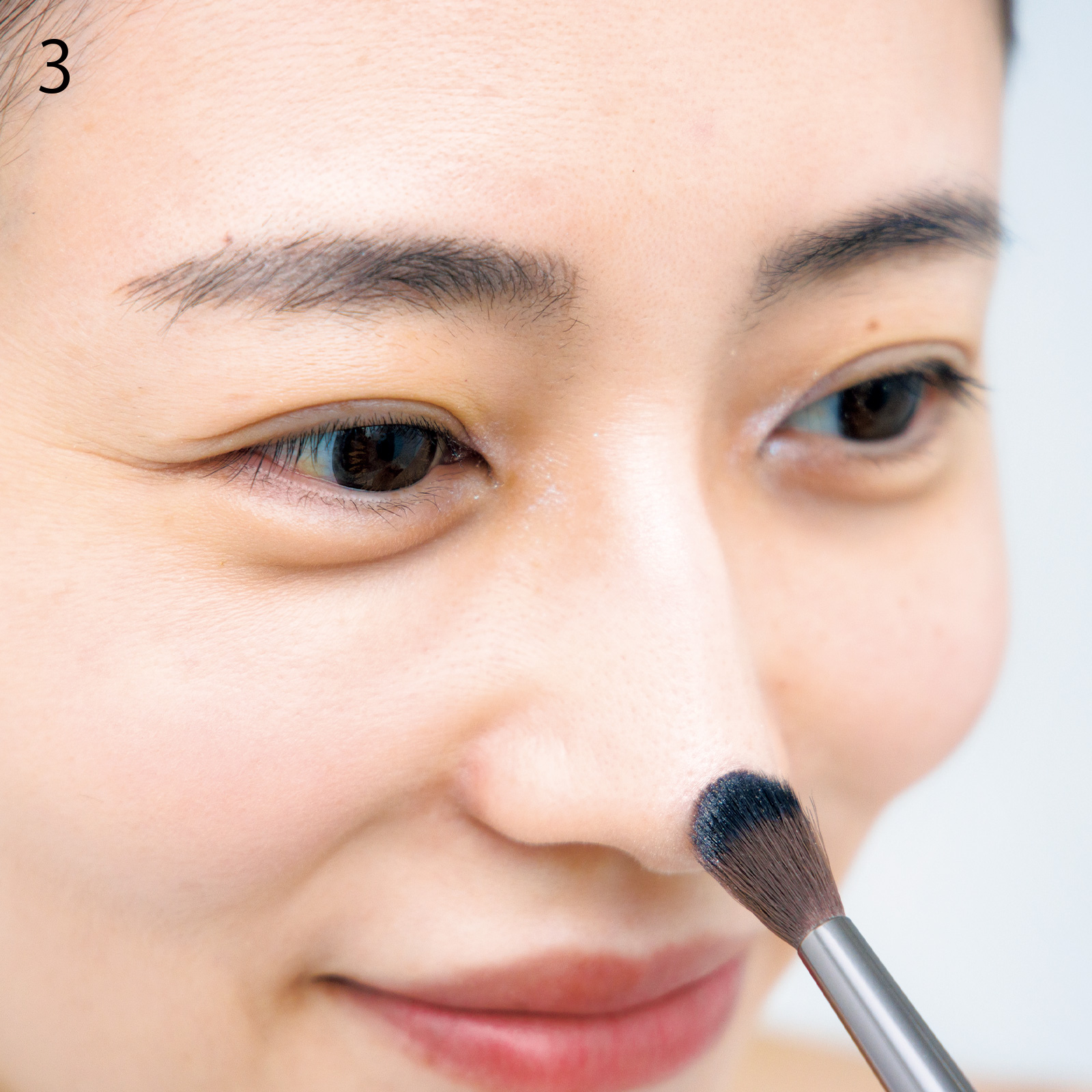 ポイント3:鼻先、鼻根、頰にDをふわっとのせて自然な透明感をだし、目頭にCを少量のせて白目をキレイに。