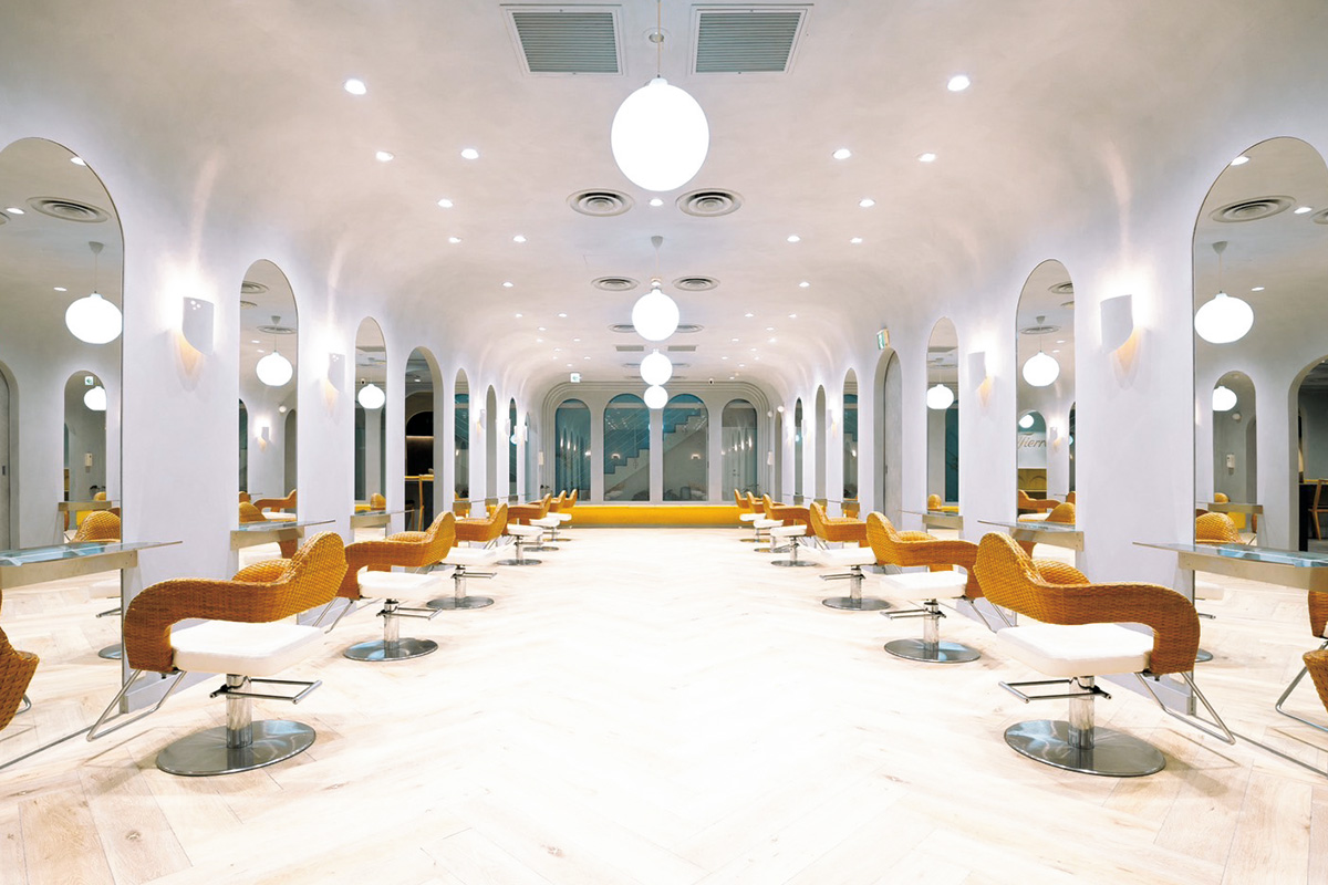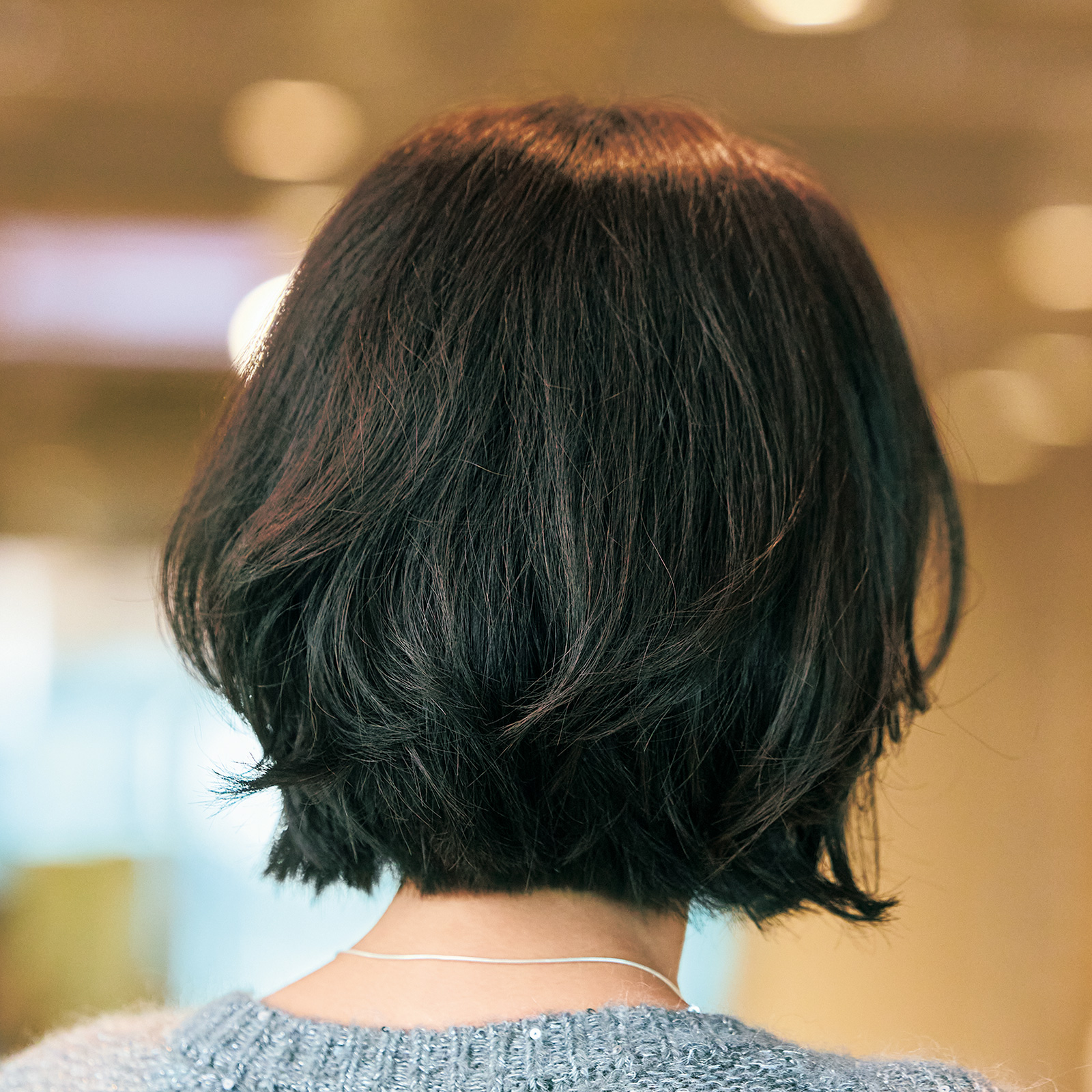 重さのある長い髪を顎ラインで前下がりにカットしてトップが立ち上がるように。薄めの前髪を目下の長めで切り、薄い生え際を隠します。全体をカールアイロンで内巻きに、サイドの毛先のみ外跳ネにしてニュアンスをプラスすれば完成。