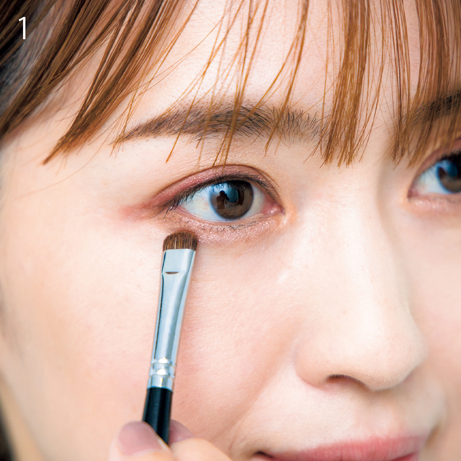 ポイント1 目の縦幅を品良く大きく見せるため、Dを下瞼の中間から目尻にのせ、ほどよくぷっくりさせます。