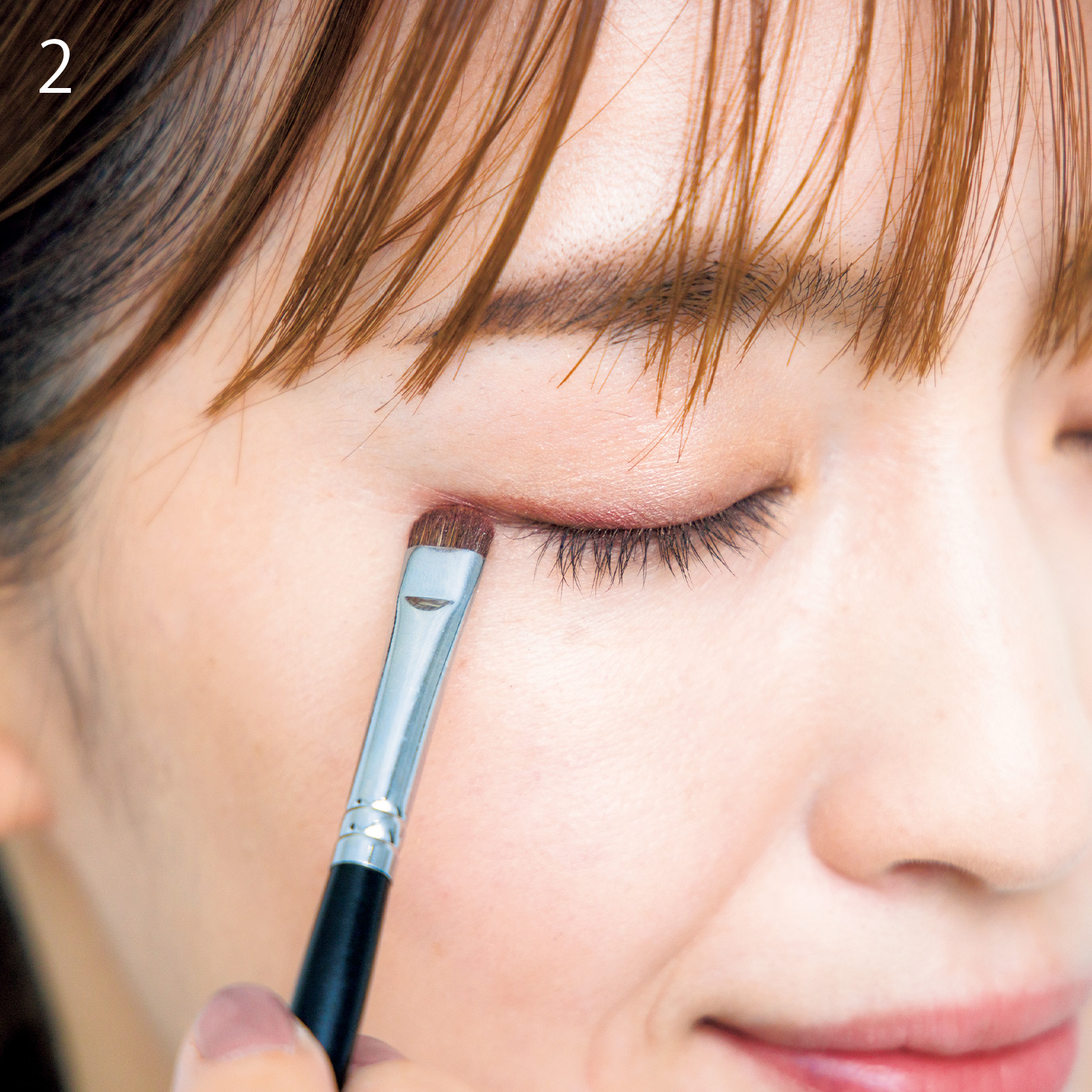 20代の頃より二重幅が狭くなってきています。二重幅を囲みすぎないようアイホール全体はベージュ系で明るめに、アイラインはできるだけ細く、色ものは目尻に少しだけ。下瞼は控えめにぷっくりさせ、さりげなく縦幅を強調。瞼に色味を使わない分、黒のマスカラ下地でまつ毛を立ち上がらせ、ブラウンのマスカラを丁寧に重ねづけ。盛りすぎず、1本1本上品に立ち上がるまつ毛を主役にします。