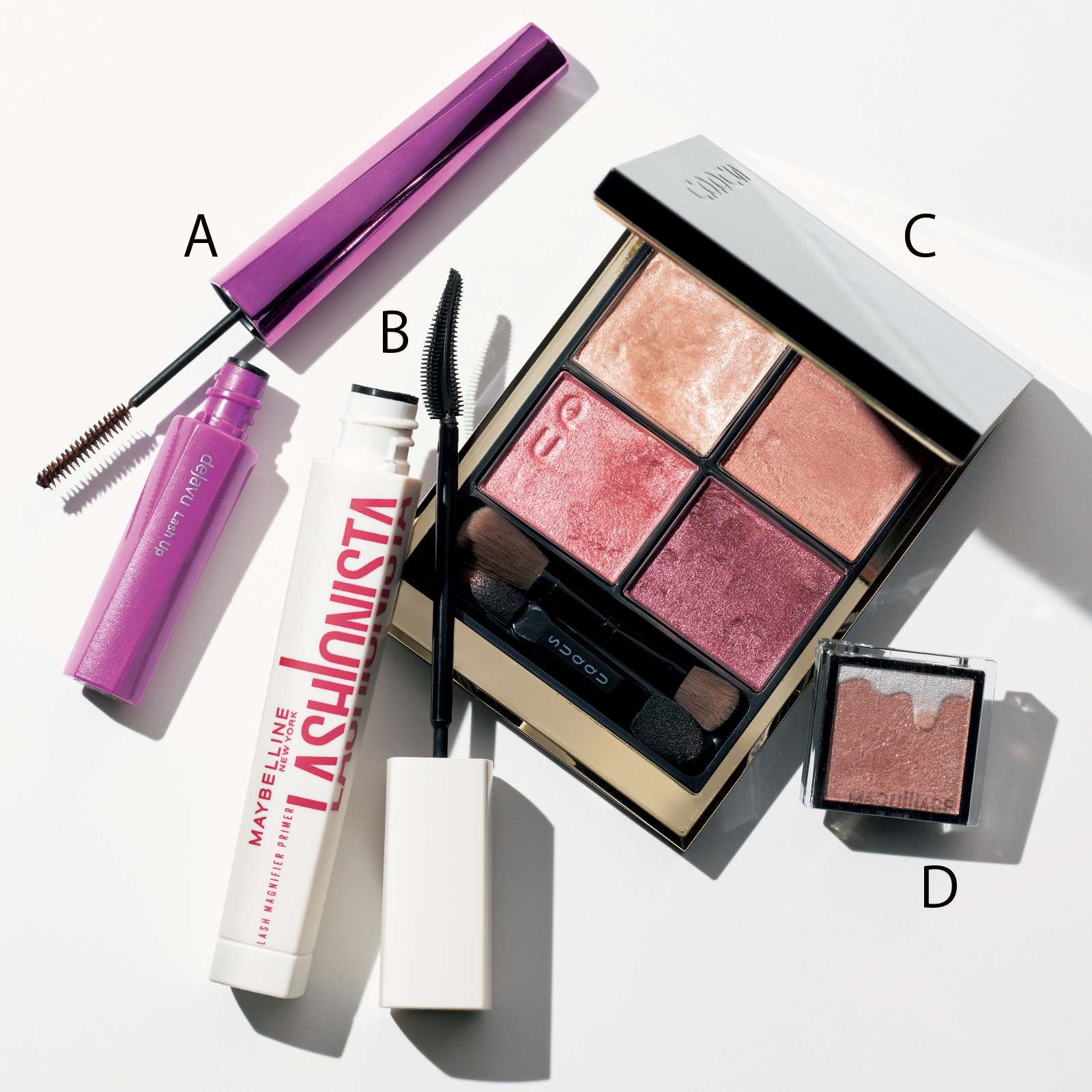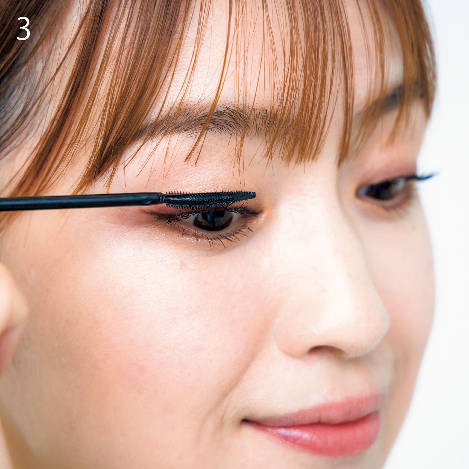 ポイント3 ビューラーでしっかりまつ毛を上げたら、Bのブラックのマスカラ下地で一番長く見せたいまつ毛の真ん中の束を下からロック。そのあと内側→外側も。さらに同じ要領でAのブラウンマスカラを重ねて完成。