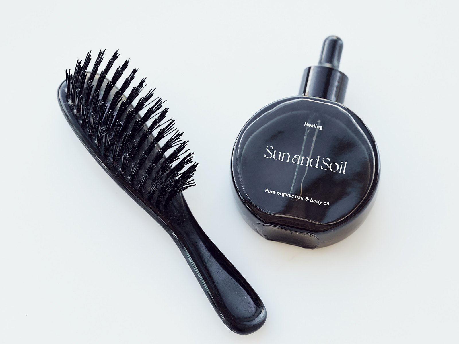 「束感が作れるだけでなく美容効果にも優れたSun and Soilのバランシングオイル。ブラシは髪にツヤが出て頭皮ケアもできるものを。パリの自宅では名品ブラシといわれるメイソンピアソンを愛用しています」