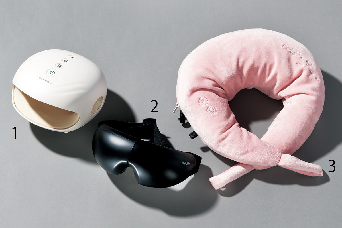首の曲線に沿うウェーブ状のもみ玉が、首筋を両側からはさみ込んで心地よくマッサージ。揉み速度は3段階。温め機能あり。入眠の邪魔をしない静音設計。15分で自動オフ。¥9,900(アテックス)