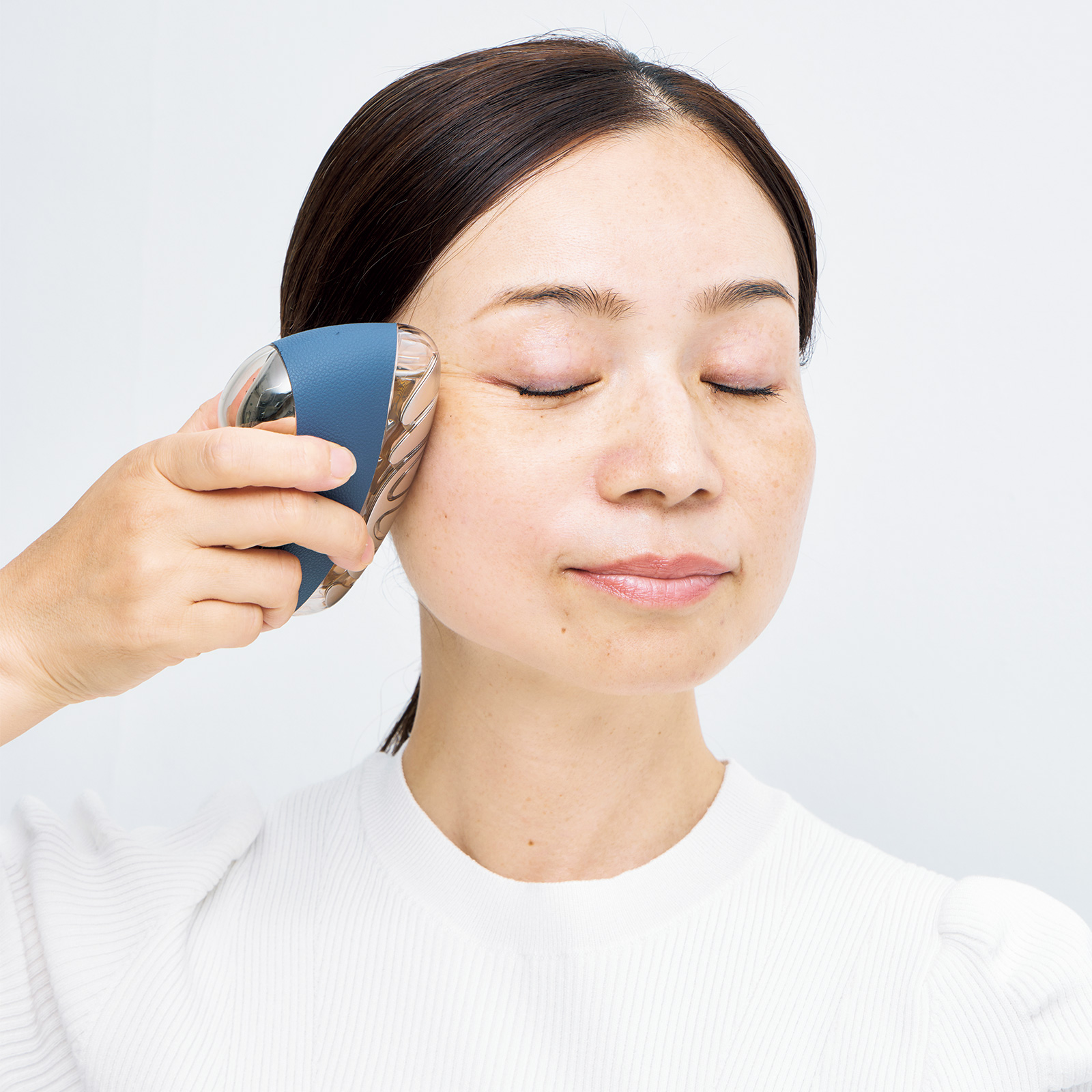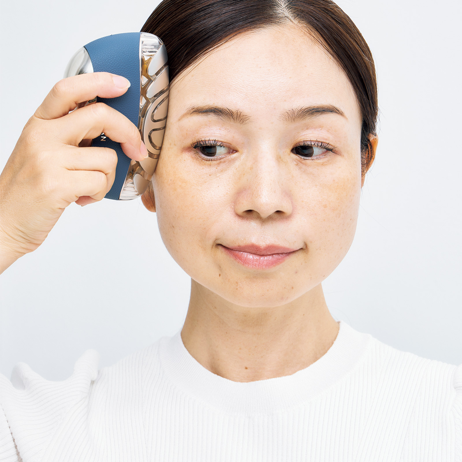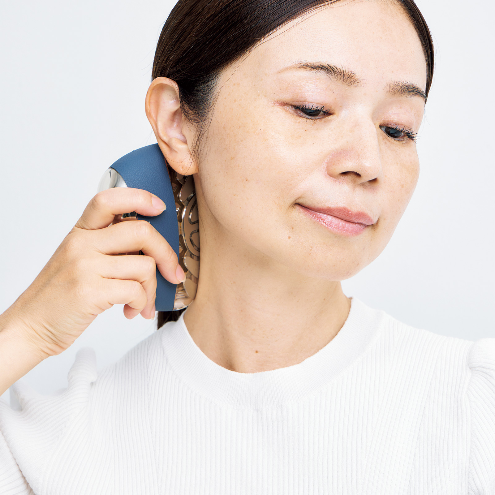 肌にフィットして押し上げやすいワイドリフトヘッド。波打つようにタッピングしていく新感覚EMSの刺激で表情筋を深く、大きく動かし1回1分でリフトケアが叶います。リフトロジー SP ¥58,300(YA-MAN TOKYO JAPAN)