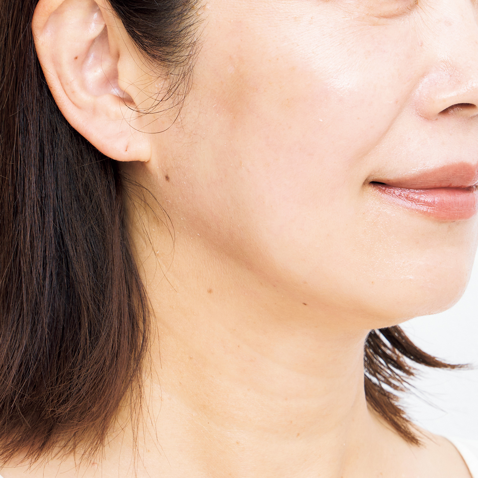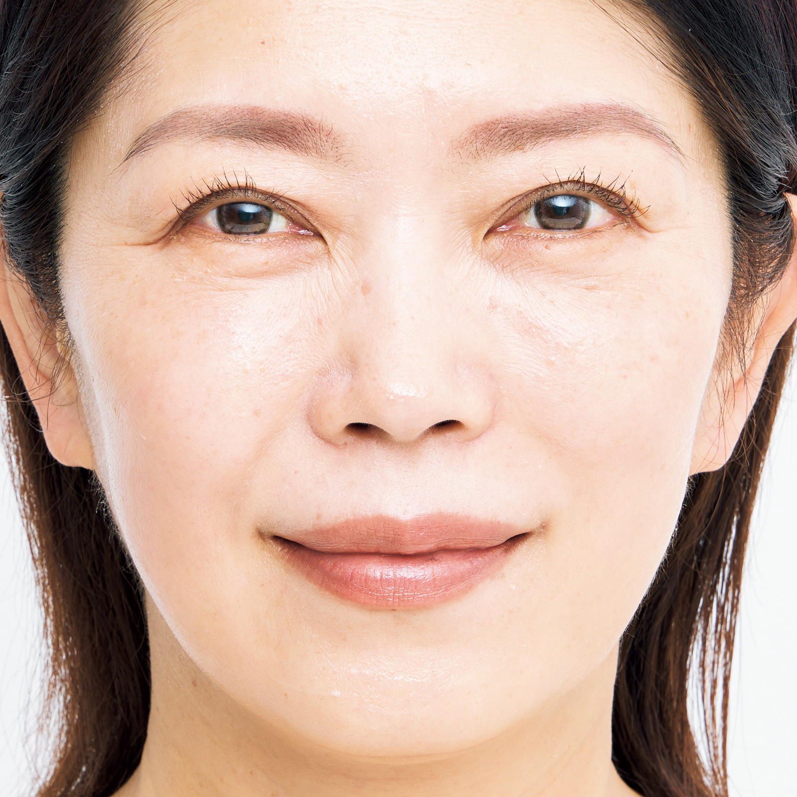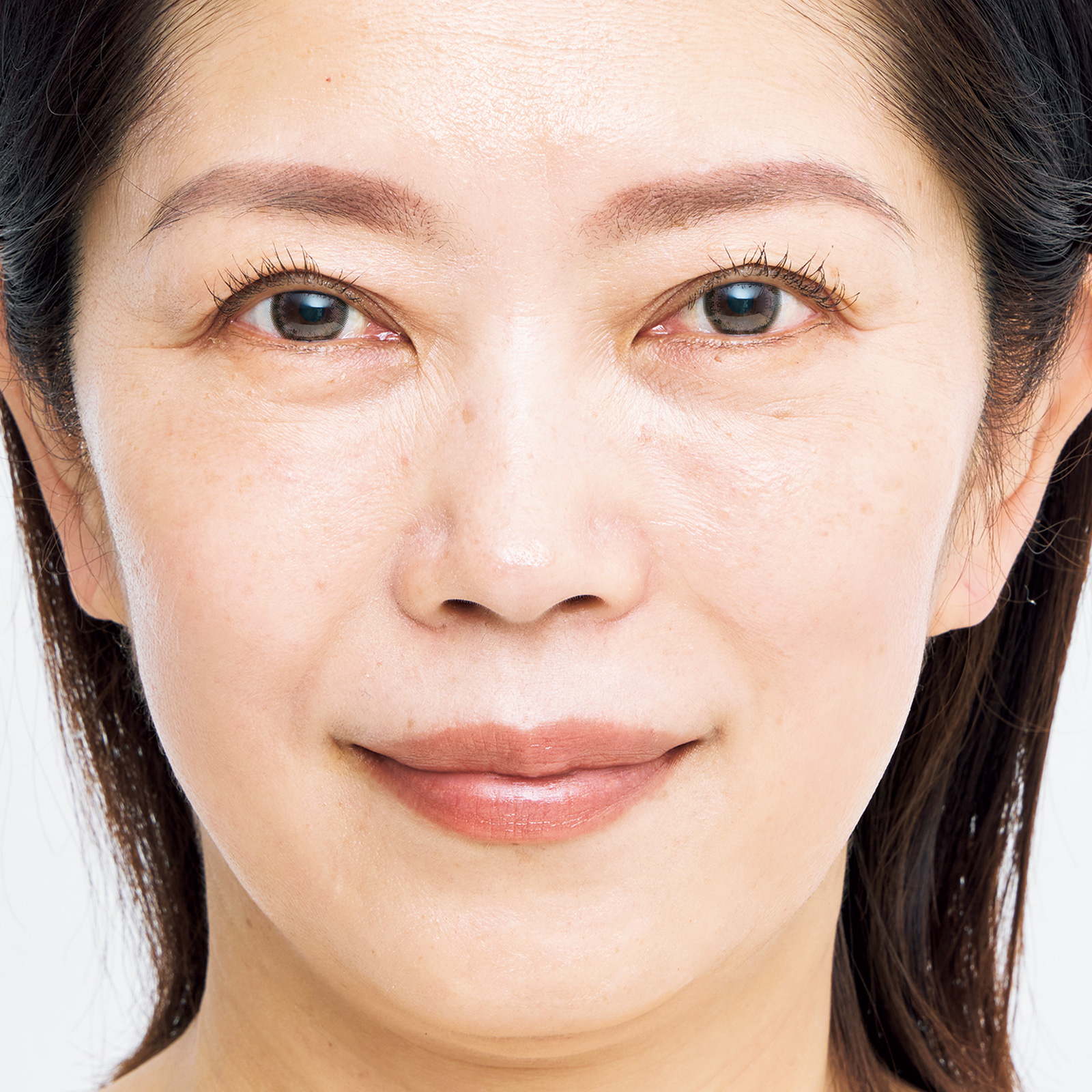 細かいたるみがフラットになり、顔全体の影が消えて、まるで肌自体がトーンアップ!ゴルゴ線やほうれい線も薄くなりました。
