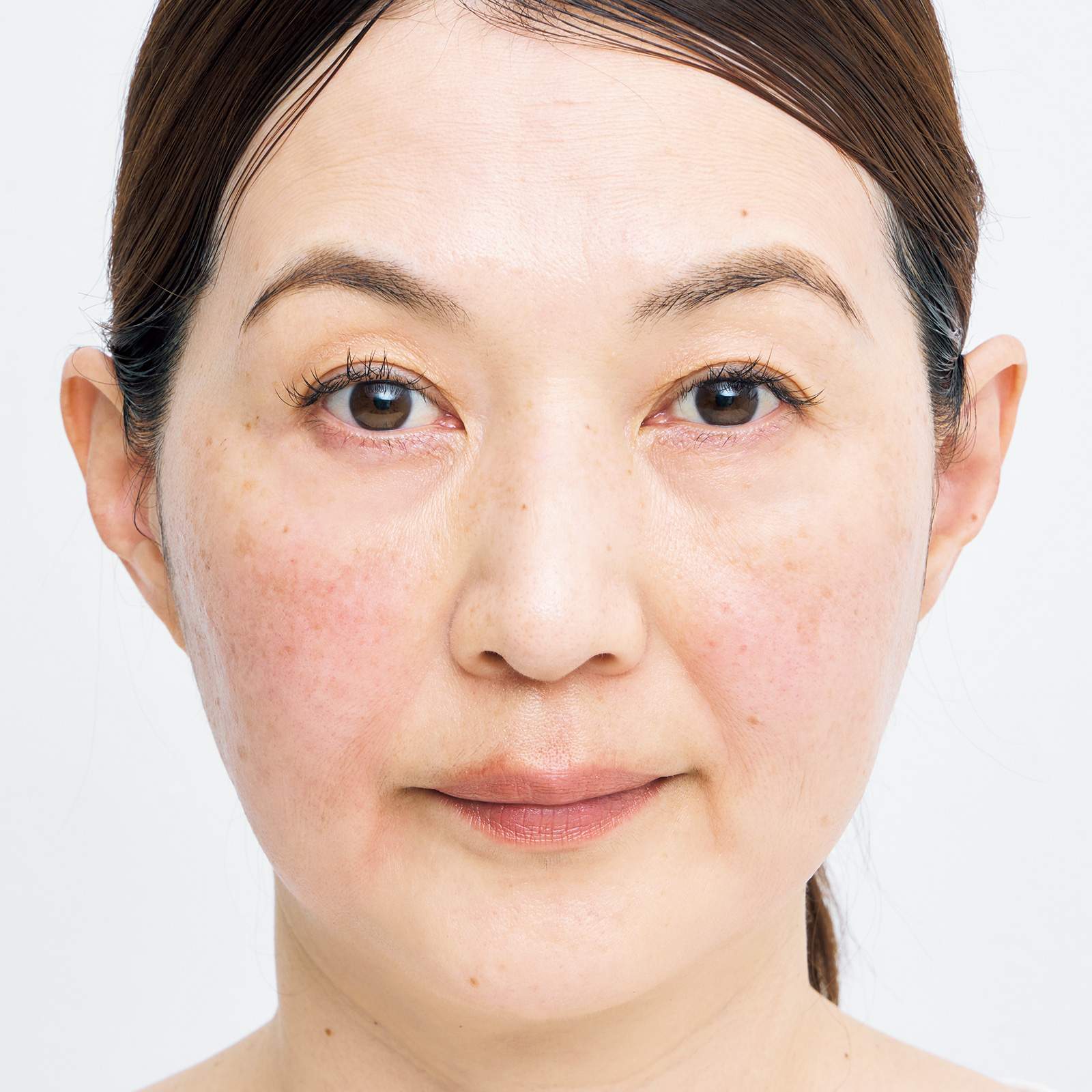 顔全体を温めることで血色が改善され、たるみがフラットになったからか、肌がトーンアップ。ほうれい線などのシワも薄くなっています。