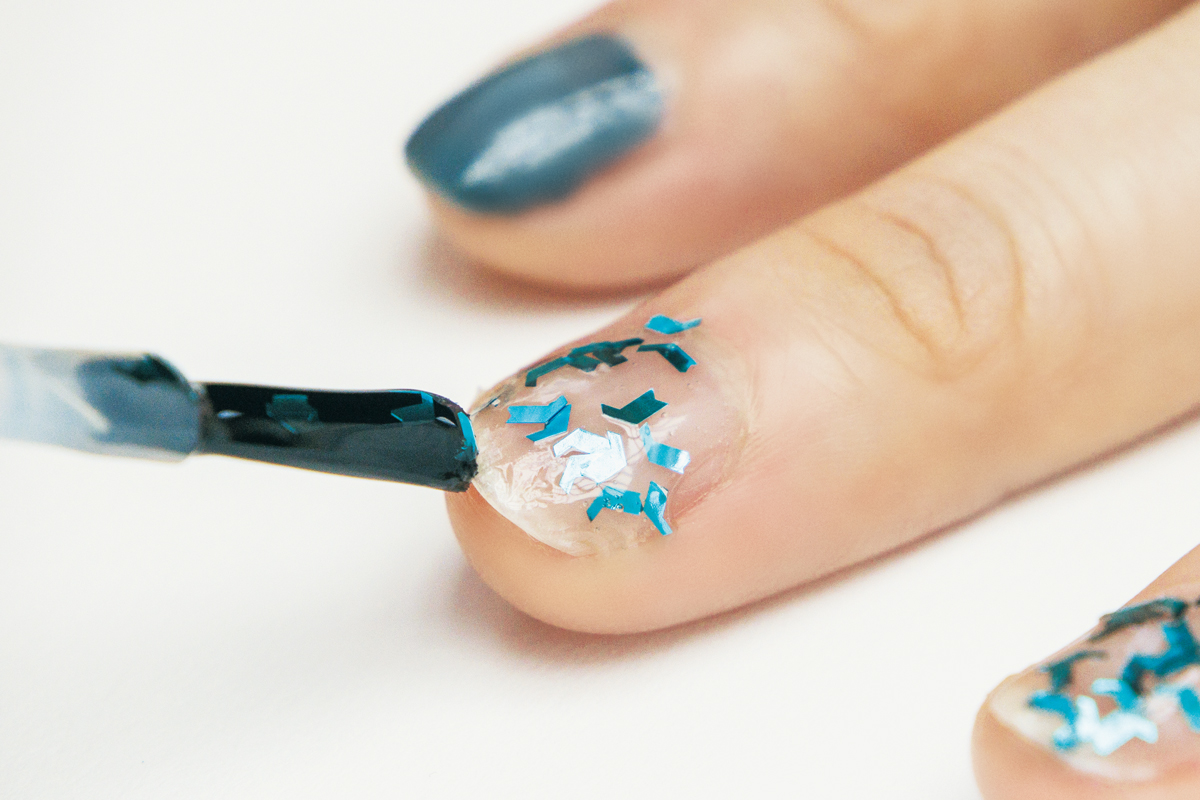 筆先にたっぷりとラメを含ませ、爪の中心から周囲へ均等にラメを散らすようにのせて。仕上げに隙間を埋めて。
