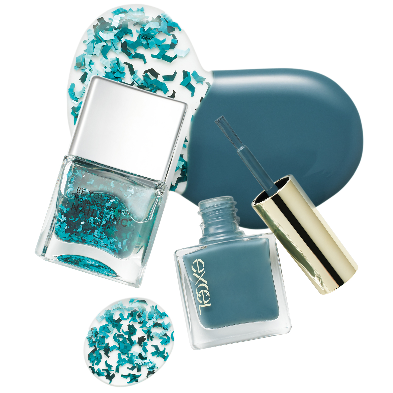 左から、存在感たっぷりのアロエの形をしたホログラムが踊るグリッターで非日常感を演出。ネイルズインク ジャスト セイイング アロー アローハ! ¥3,080(ネイルズインク/TAT inc.)光を取り込む透明感のある発色で一度塗りでシアーな仕上がりに。2度塗りすると見たままの色が出ます。エクセルネイル NL14 オーシャンフロント¥1,100(エクセル)