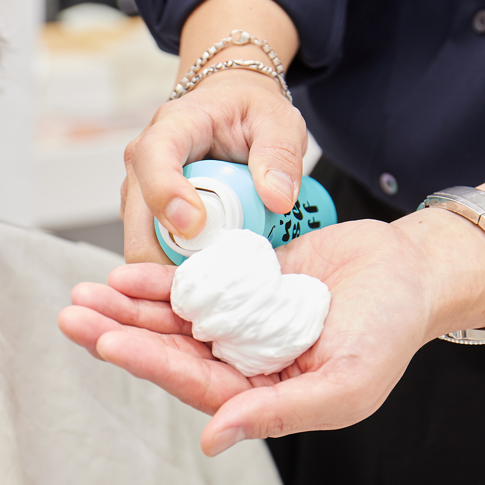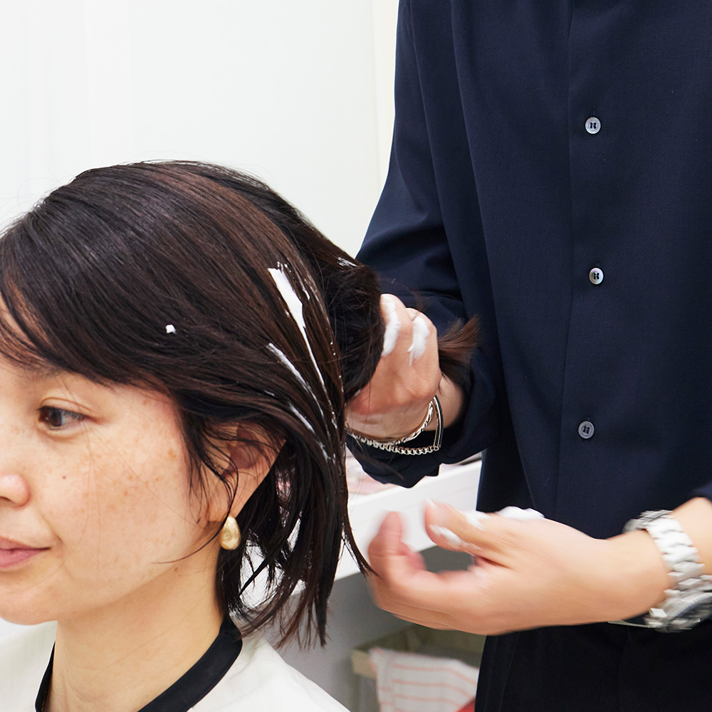 ネジュさんのヘアケアブランド「ネジュ(Néjoo)」の「ドントウォッシュトリートメント(Don’t Wash Treatment)」(150ml 税込3,960円)をボブなら卵1つ分程度使用して全体になじませます。べたつかずさらりとした使用感で、髪の栄養・保湿・光沢を手軽にケア。気になるアホ毛なども落ち着かせてくれます。