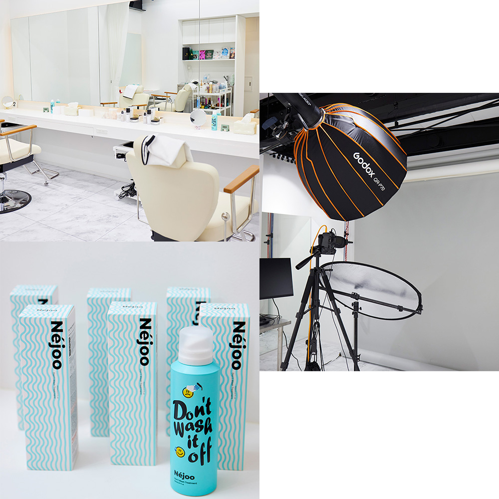 今回、撮影場所としてお借りした「RIZZ HAIR MAKE UP&PHOTO STUDIO」は、INIやIS:SUE、その他にも今話題の芸能人などを実際に担当しているヘアメイクアップアーティストの施術を体験できるサロン。併設スタジオでプロのカメラマンによる撮影・レタッチサービスまで受けることができます!「ネジュ」の「ドントウォッシュトリートメント」の取り扱いもあり。