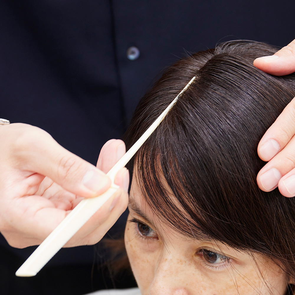「髪全体にある癖を活かして襟足部分がくびれるようなシルエットにし、ツヤ感のあるスリークヘアをつくります。近年、世界的にも流行していて、韓国の女優さんや40代の人にも人気のトレンドヘアです。直線的な分け目をつくってさらにモード感を出していきましょう」(ネジュさん)