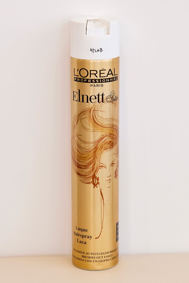 「韓国のトレンドヘアに大事なのはトップのボリュームです」(ネジュさん)。仕上げに吹きかけるイメージのハードスプレーですが、ネジュさんは両手につけて使用。手のひらに吹きかけたスプレーを擦り合わせたら、分け目を挟むように手のひらを頭に乗せて、分け目に向けて持ち上げるようにトップにボリュームをつくります。愛用のスプレーはプロ御用達の「ロレアルプロフェッショナル エルネットサテン」。