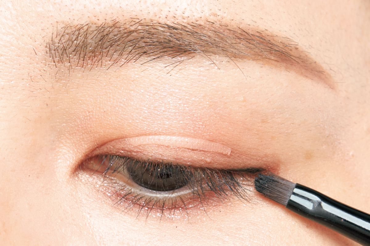 たるんで二重幅が狭くなってきた目元には、アイカラーは横グラデではなく縦グラデがおすすめ。さらに黒ライナーの部分使いで、吸引力のある目元が復活! 100均のアイテープを仕込むのも◎。