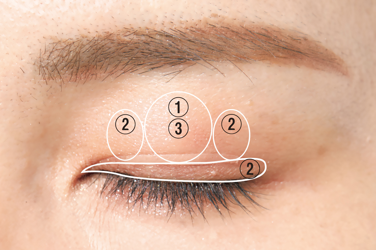 Cのプライマーでシャドウの密着力を高めたら、A(スナイデル)の①を中央にのせ、その左右と目の際に②をのせる。③は①の上に重ねて立体感アップ。