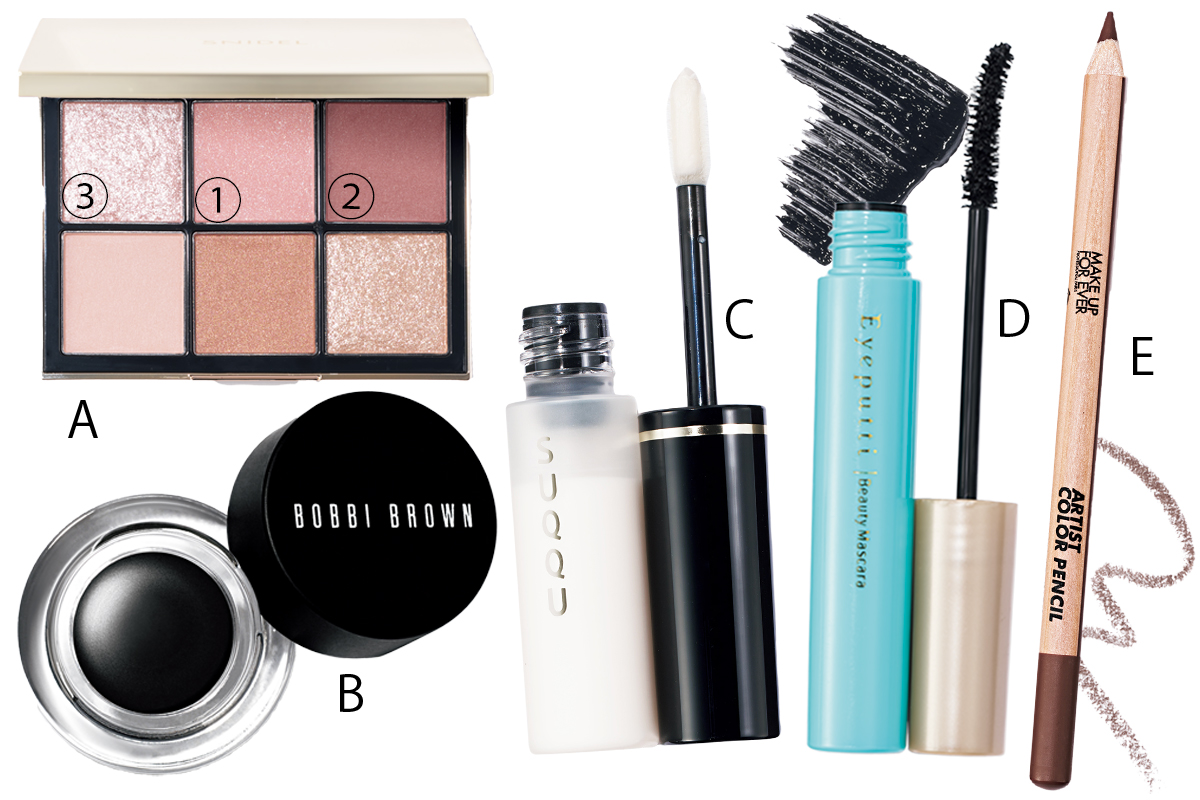 A.シアーなブラウンと澄んだピンクで立体感をプラス。SNIDEL アイデザイナー 10 ¥6,380(スナイデル ビューティ)B.濃密なジェルがピタッと密着し、繊細なラインも思いのままに描ける。速乾性抜群&長時間安心のウォータープルーフ。ロングウェア ジェルアイライナー ブラックインク ¥4,620(ボビイ ブラウン)C.質感キープと発色アップを叶える目元用下地。アイ エンハンシング プライマー¥3,850(SUQQU)D.まつ毛を強力カールキープして一日中にじまない。アイプチ® ひとえ・奥ぶたえ用マスカラ リッチブラック ¥1,320(イミュ)E.なめらかでスルスル描ける。アーティストカラーペンシル608 ¥3,080(メイクアップフォーエバー)