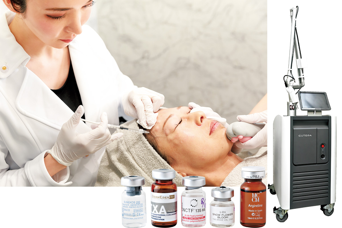 患者の症状に合わせ、美白成分配合カクテルのレシピも様々。ハリ感が足りなくないか、美白度合いは?とオーダーメイドでのオリジナルメニュー。シミ、色ムラ、くすみの蓄積を一気に綺麗にリセットしたい人にお勧め。