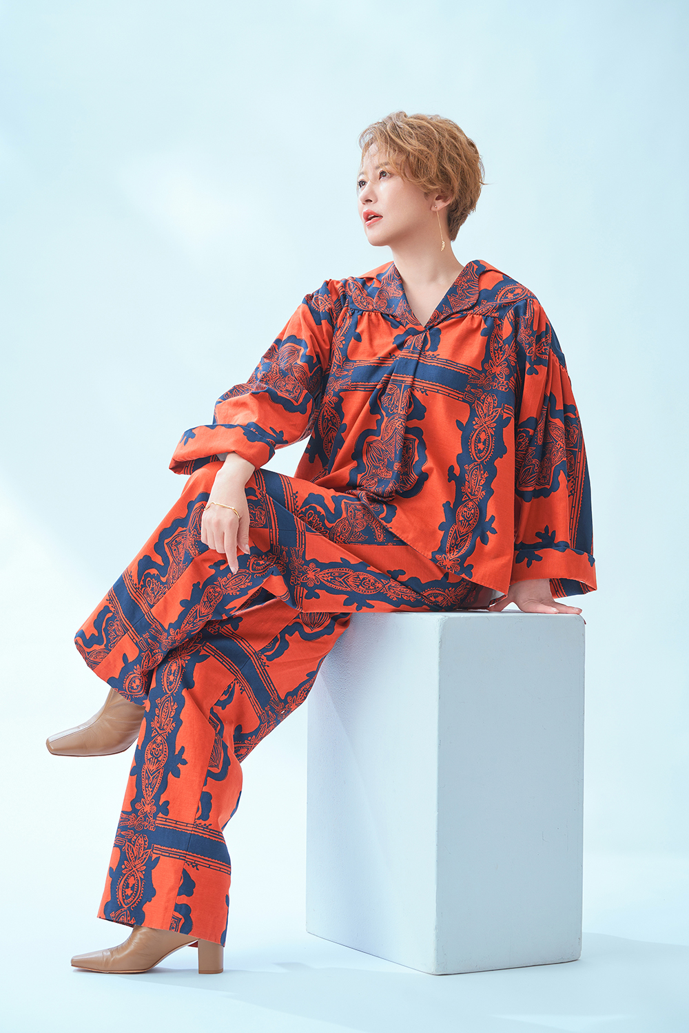 ブラウス¥40,700 パンツ¥36,300(すべてミュラー オブ ヨシオクボ)イヤカフ¥29,700 ピアス【右耳】¥99,000 ピアス【左耳】¥99,000 ブレスレット¥594,000 ハンドカフ¥33,000(すべてカラットアー/ヴァガス)ブーツ¥83,600(ネブローニ)