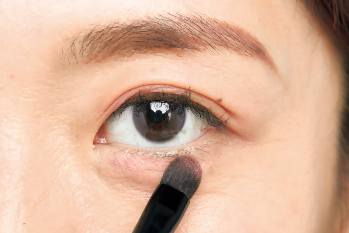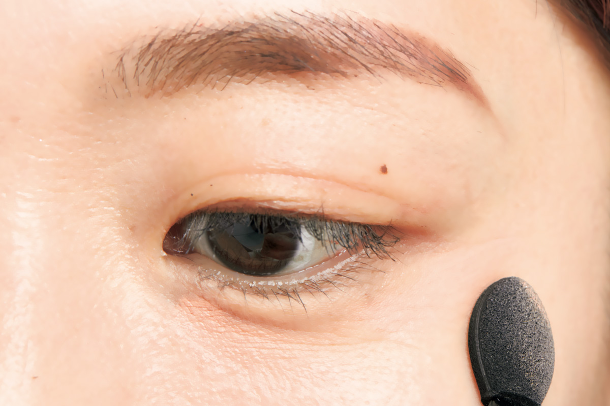 アイラインとマスカラを塗布後、Dのコンシーラーを筆にとり、目頭~涙袋の下、目尻とL字に大胆にのせる。たるみの影が払拭されて涙袋が強調され、よりぷっくり感がアップ。