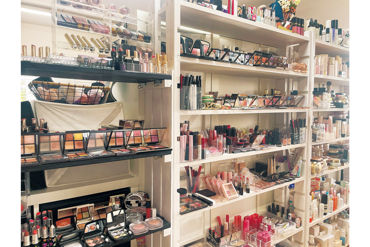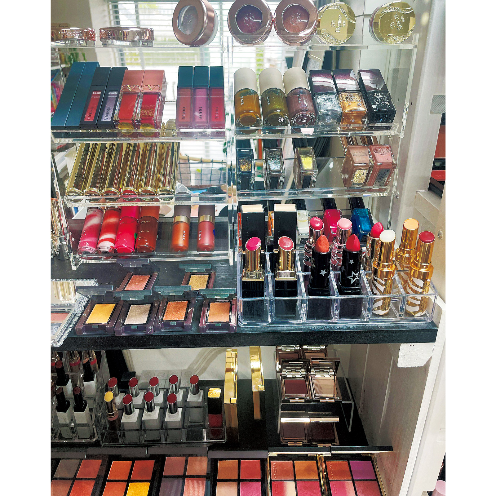 上半期・下半期、デパコス、韓コス、さらにブランドごとに陳列。カラーアイテムは蓋を開けておくことで選びやすい。
