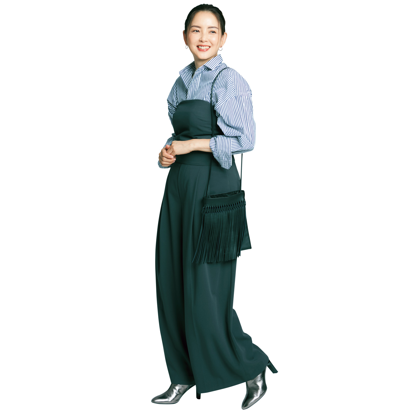 洒落感のあるパンツスタイルでオフィスでも華やかに。オールインワン¥29,920(ネイヴ/オンワード樫山 お客様相談室)シャツ¥26,400(ティッカ)バッグ¥16,500(ノマディス/ドレステリア 渋谷スクランブルスクエア店)ブーツ¥31,900(ダイアナ/ダイアナ 銀座本店)ピアス¥15,400〈tsugumi iwamoto〉ネックレス¥28,600〈Sa.Ya.〉(ともにロードス)バングル¥13,750(Hh/フォーティーン ショールーム)