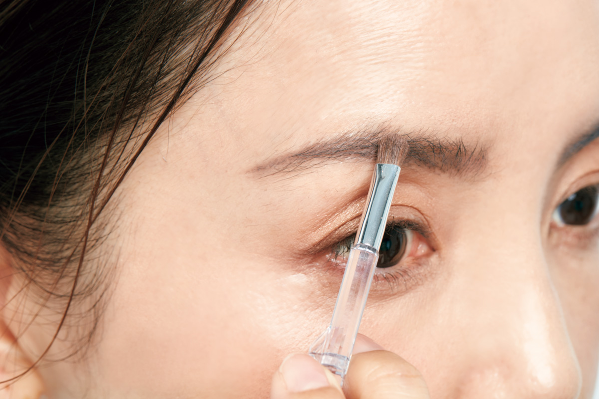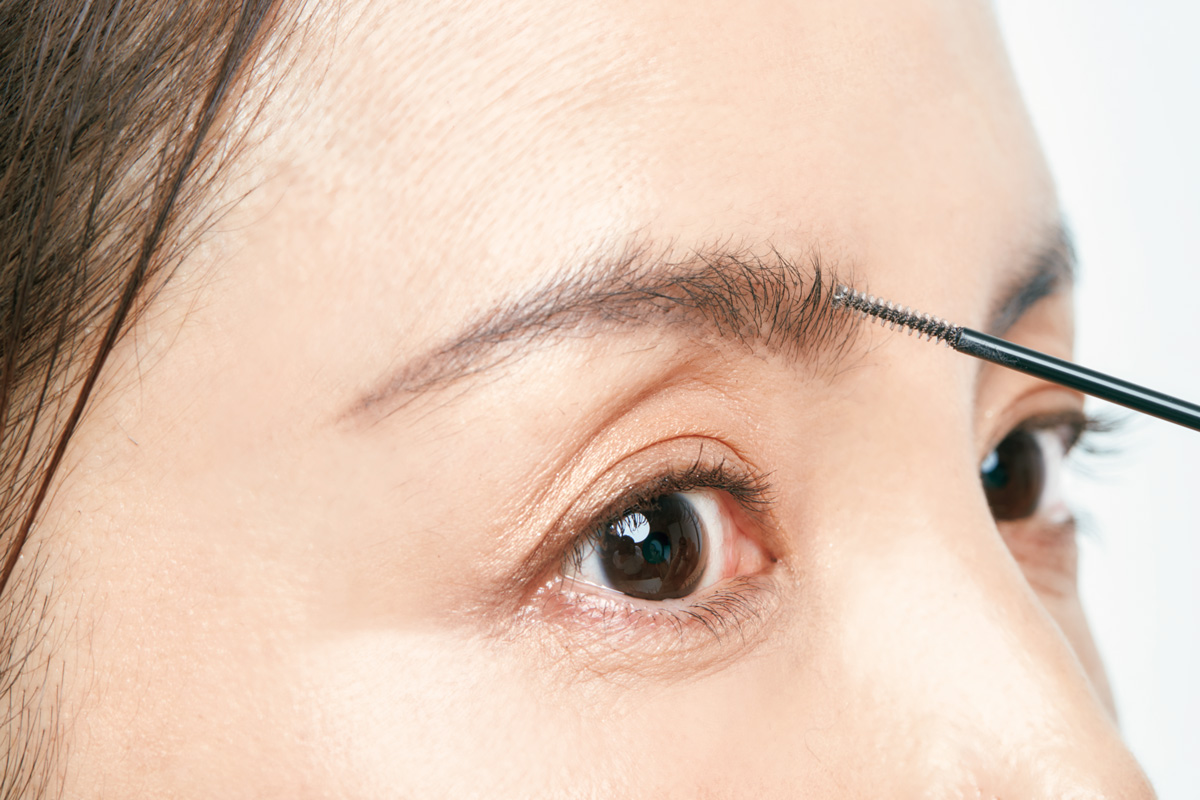 知的にしたいときは、グレーのペンシルで眉尻をキリッと仕上げ、クリアブラックのマスカラで毛流れを強調。