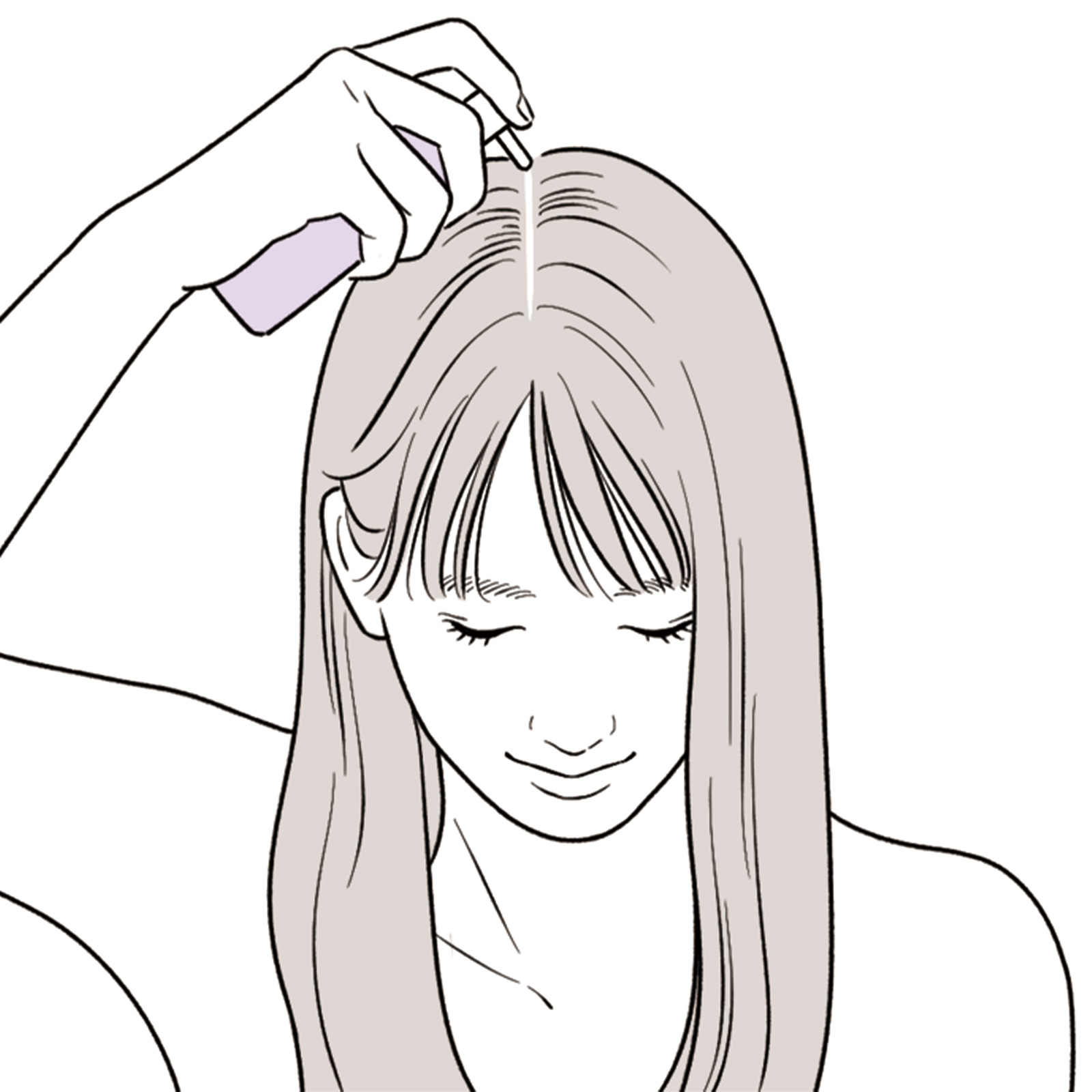頭皮にしっかり塗布できるように分け目に直接なじませて。直接塗りにくい容器なら100円ショップなどにある細いノズルの容器に移すのも◎。