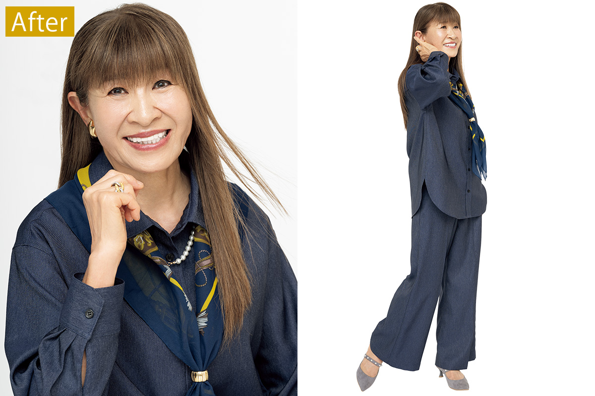 「現役の歯科医として働いていますが、より一層元気でいるためには見た目が重要だと、プロにヘアメイクをしていただき実感しました。いつもはラブリーなファッションをすることが多いので、スタイリッシュな衣装が新鮮で驚きました。新しい経験は刺激になりますね。撮影時の写真を見て周りのお友達も刺激を受けたようです」
