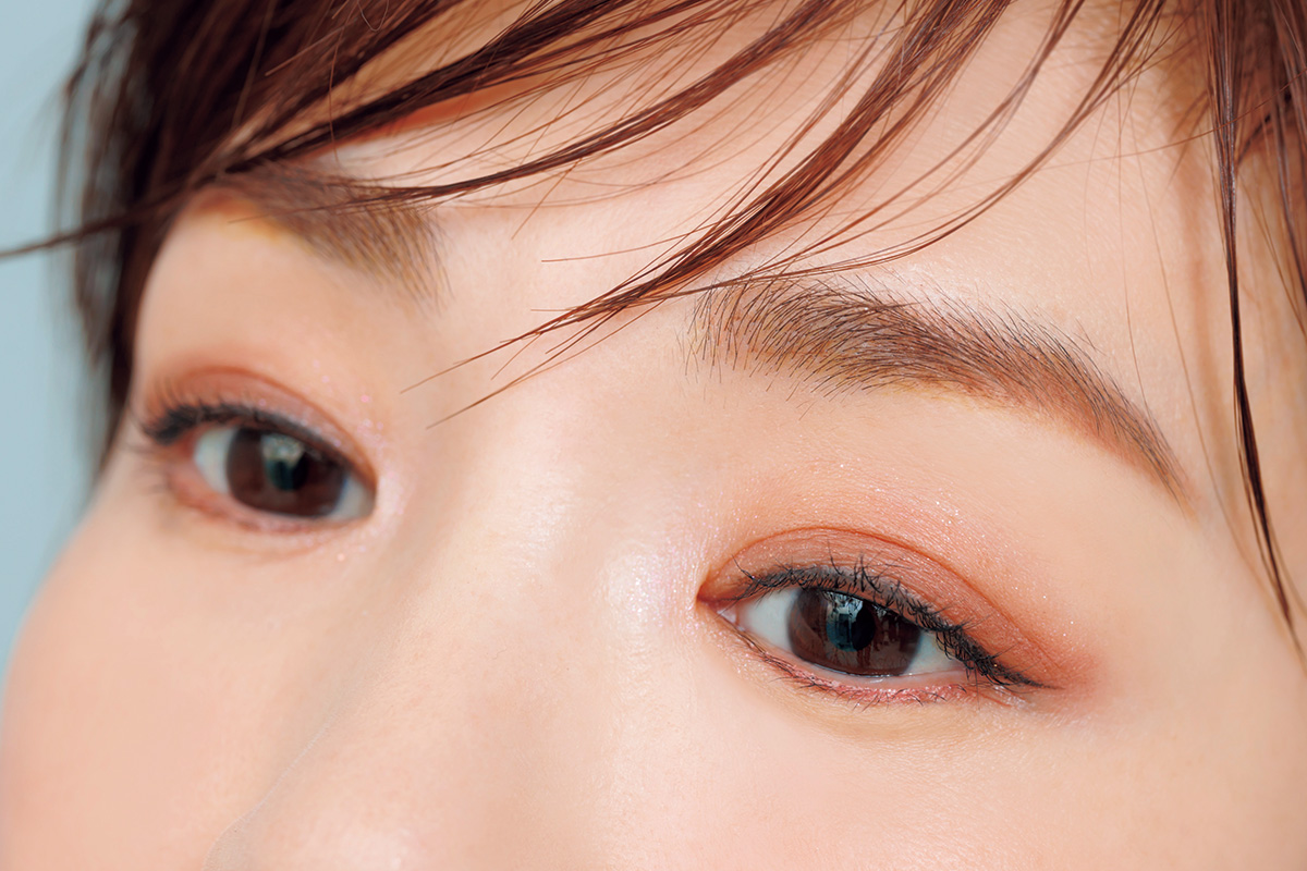 bの右上をアイホール全体に。下まぶたにも目頭から目尻にかけてラインのようにのせて。二重幅には右下・左下をお好みでブレンドし、アイラインがわりに引けばほどよく目力を強調。左上を目頭にポイントでのせれば、グッと求心的で引き締まった印象に。