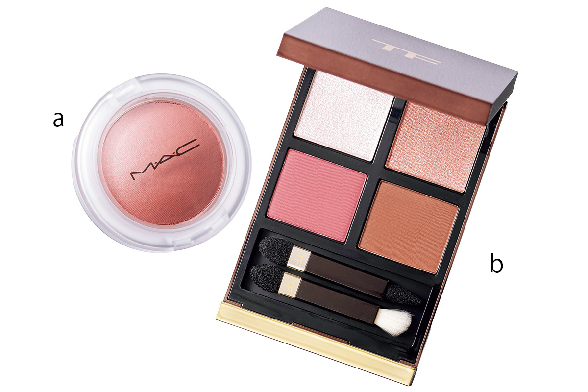 a.ミラーレスに使えて、素肌に溶け込み、自然な色づき。グロー プレイ クッショニー ブラッシュ ブラッシュ プリーズ ¥4,950 (M・A・C)、b.くすみ感ピンクは大人まぶたと相性抜群。アイ カラー クォード 02S ¥12,980 (トム フォード ビューティ) ※数量限定