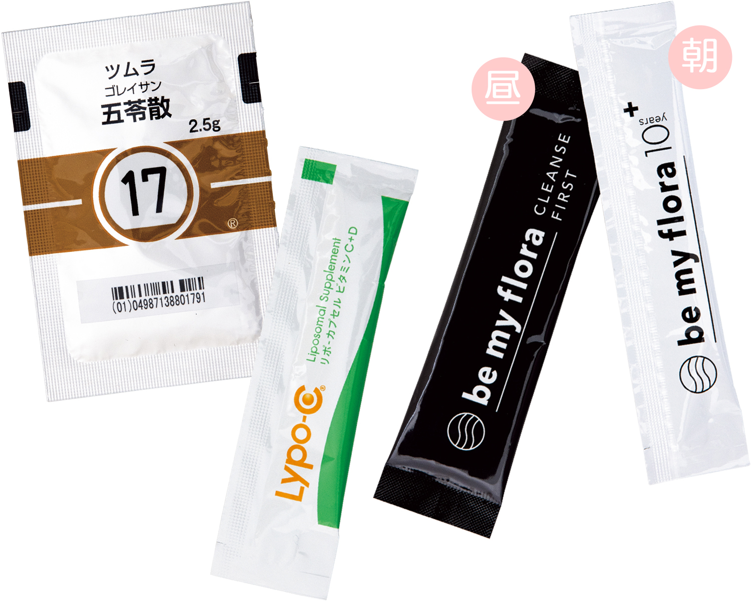 1日3回の五苓散は体内の浮腫みや巡り対策に。リポC+Dは定期購入しています。be my floraのクレンズファーストは朝の白湯に溶かして、酵素ペーストは日中にそのままパクッと。
