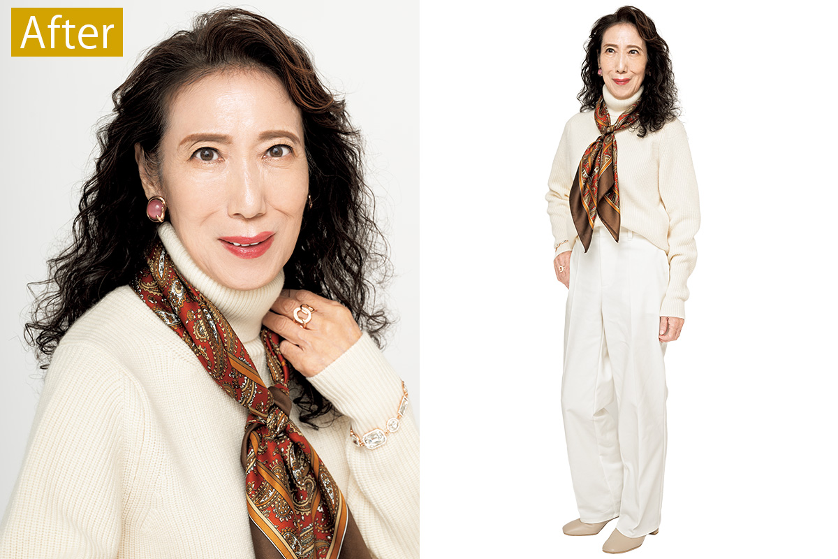 「こんな素敵な経験をさせてくれた娘に感謝です。忘れられない一生の思い出になりました。今までクローゼットは暗めの色合いのお洋服が大部分を占めていましたが、変身撮影後、明るめの色味のお洋服もいいかなと思うようになり、新たな服を買い足してしまいました(笑)。お肌のお手入れも若い頃のように念入りにするようになり調子がいいです」